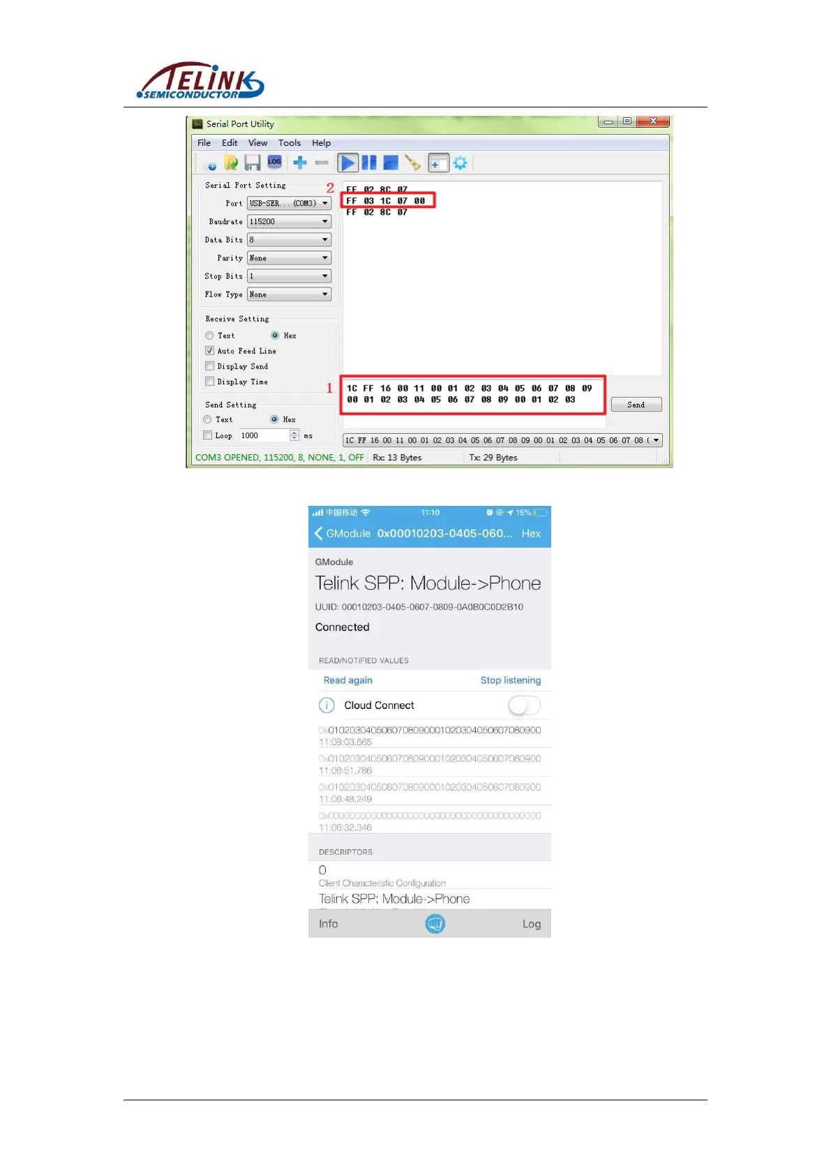 The phone can send data to the module, the module will report to the PC after it receives