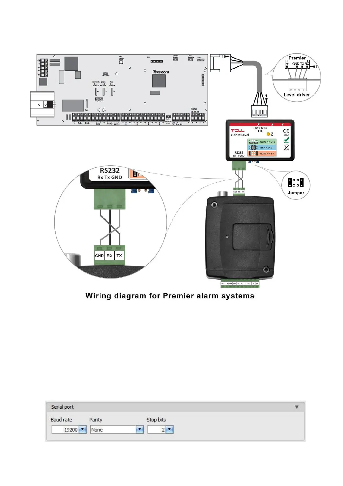 For Premier alarm control panels, a level driver interface is needed to establish the serial link.