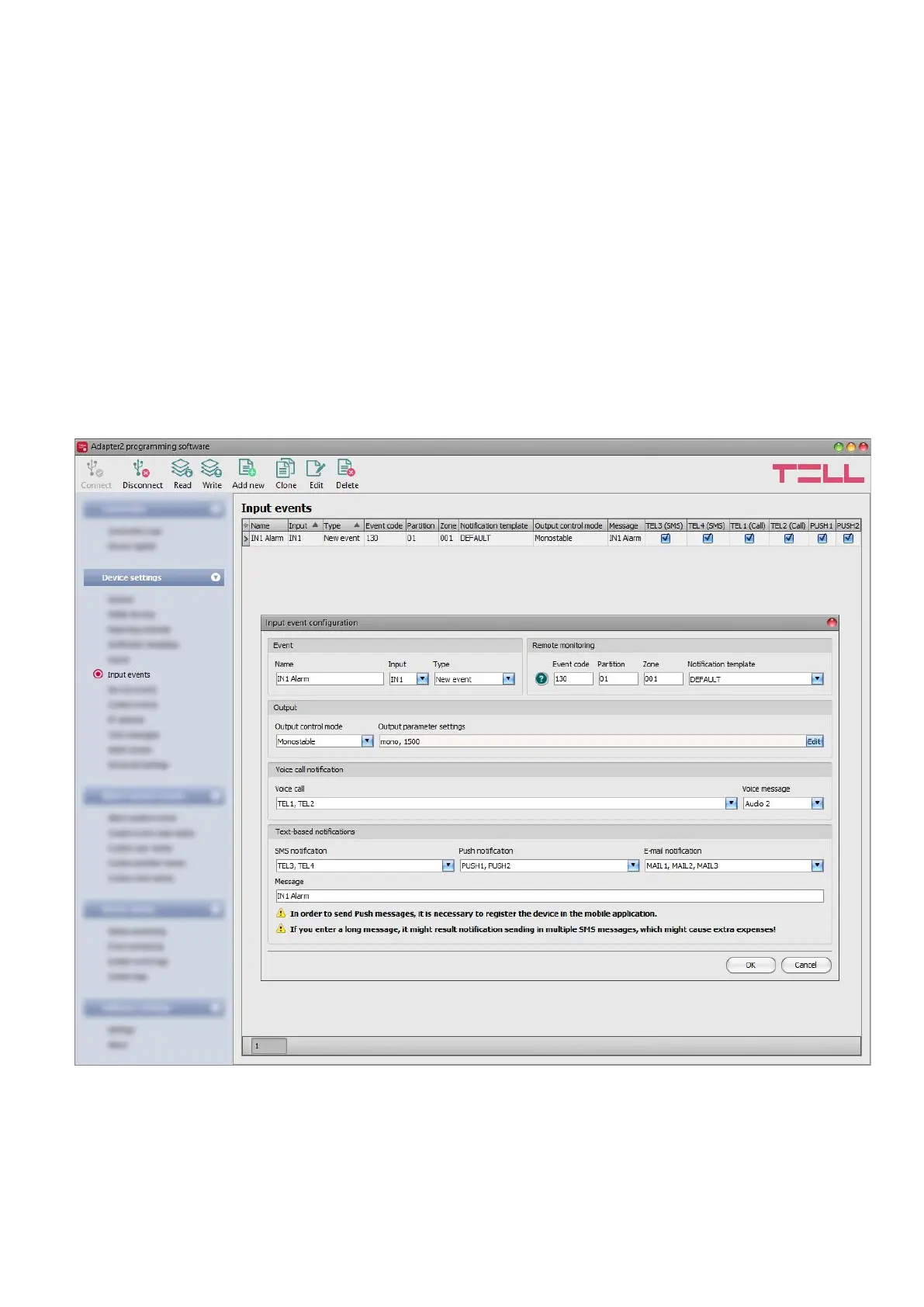 In this menu you can configure the events generated by the 4 contact inputs and notifications to