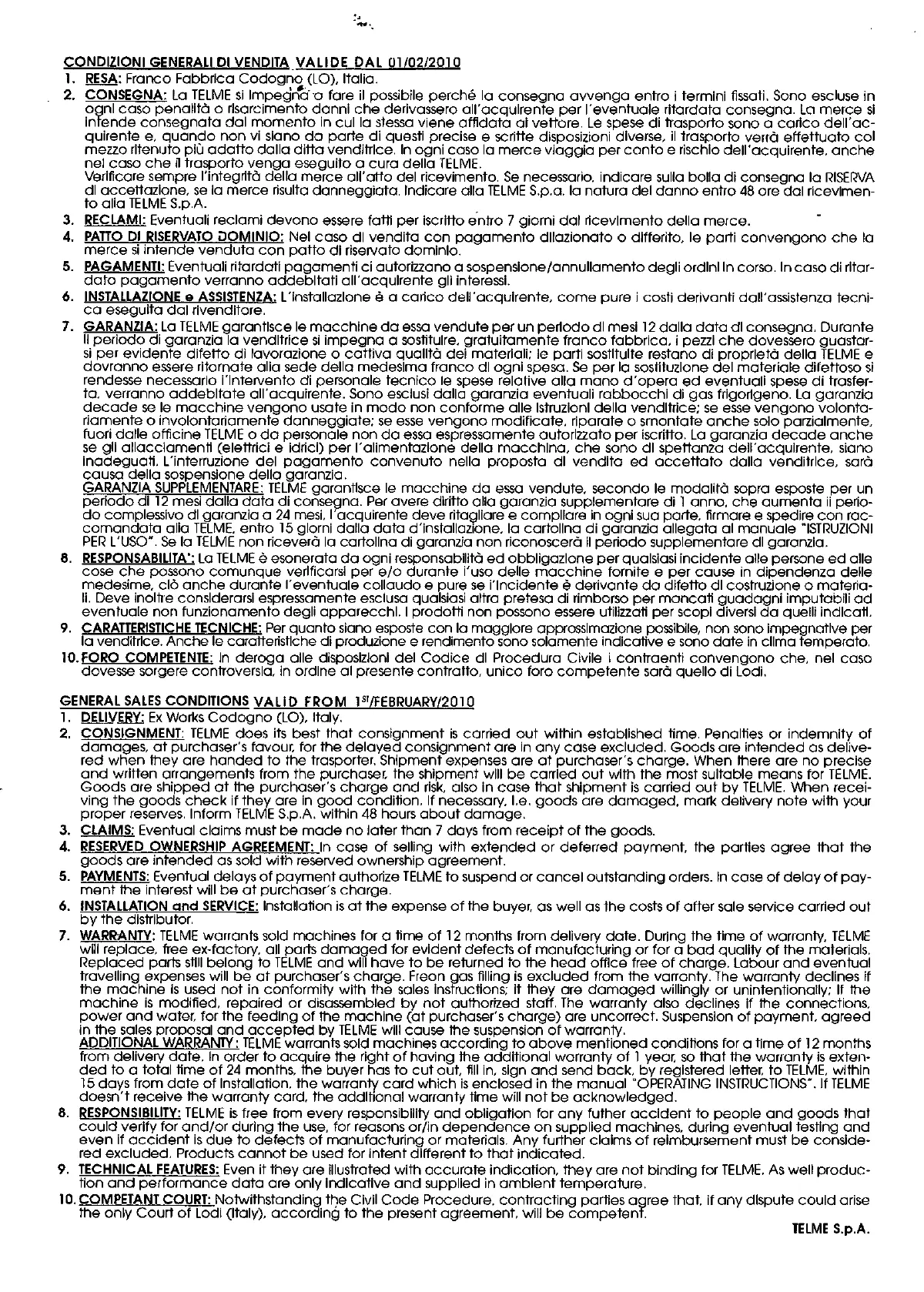 GARANZIA SUPPLEMENTARE: TELME garantlsce le macchlne da essa vendute, secondo le modalltd sopra esposte per un