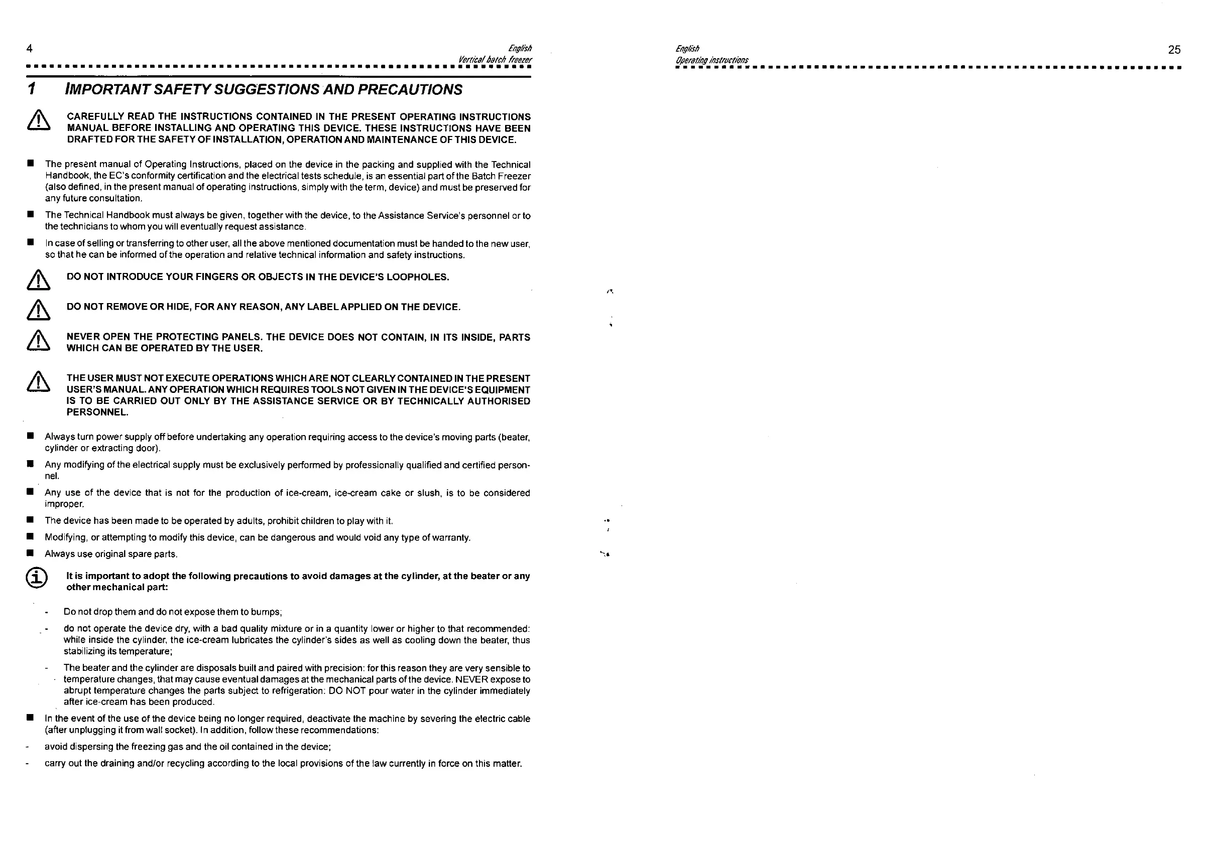 Handbook, the EC's conformity certification and the electrical tests schedule, is an essential part of the Batch Freezer