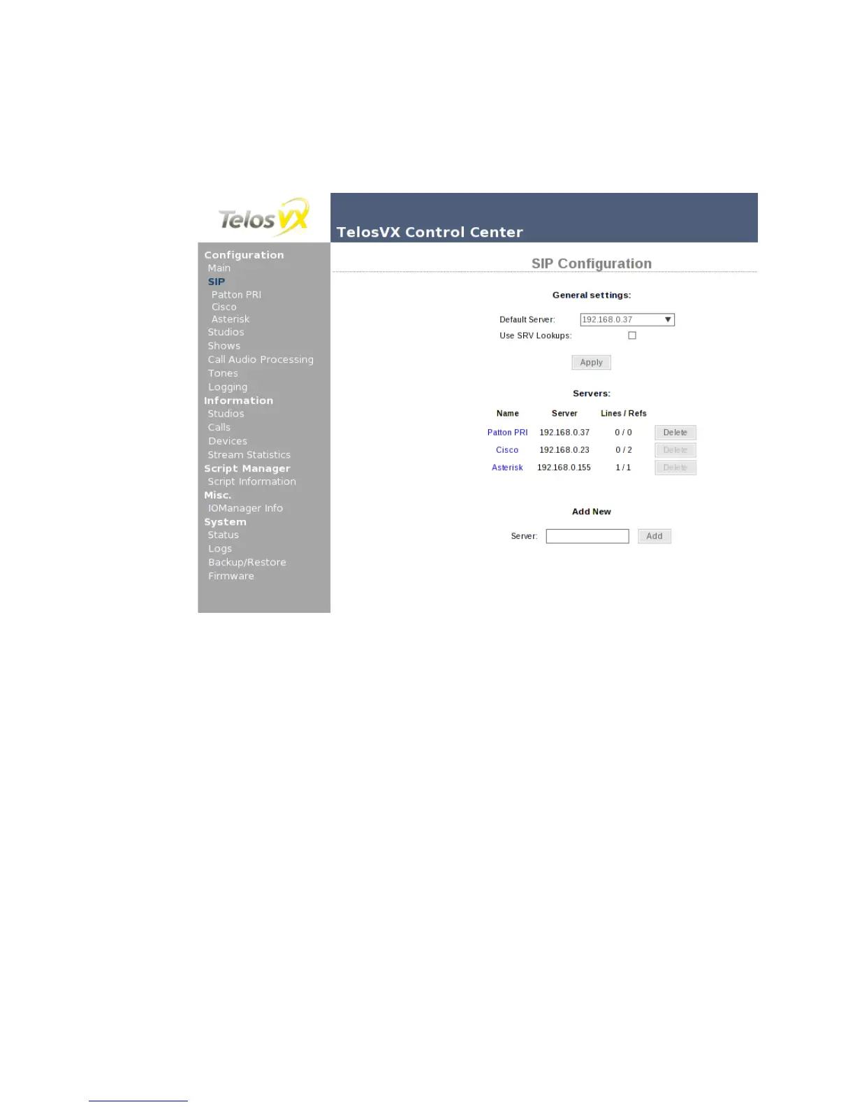 The SIP configuration page shows the global SIP settings, along with a list of all SIP servers VX