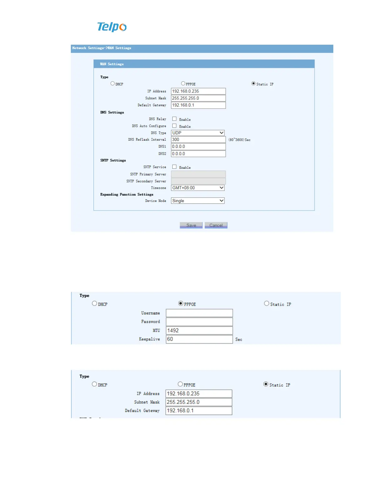 Enter IP address, subnet mask and default routing IP address, and then click to save.