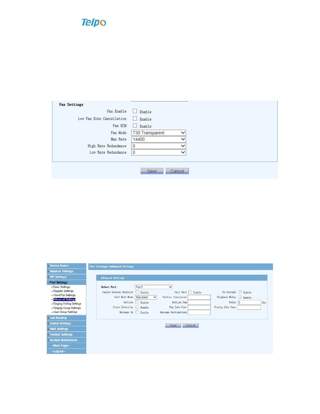 Fax modes: It includes three modes of Voi ce, T38 and bypass (T30);