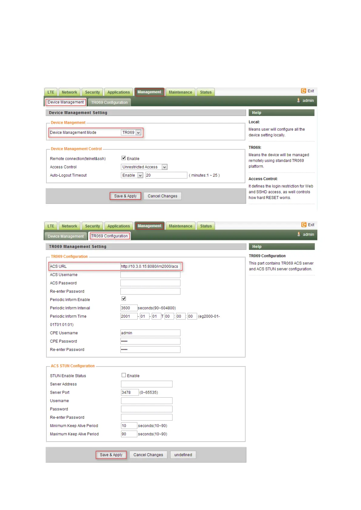 After setting the Device Management Mode as TR069, you must also configure the validity acs url