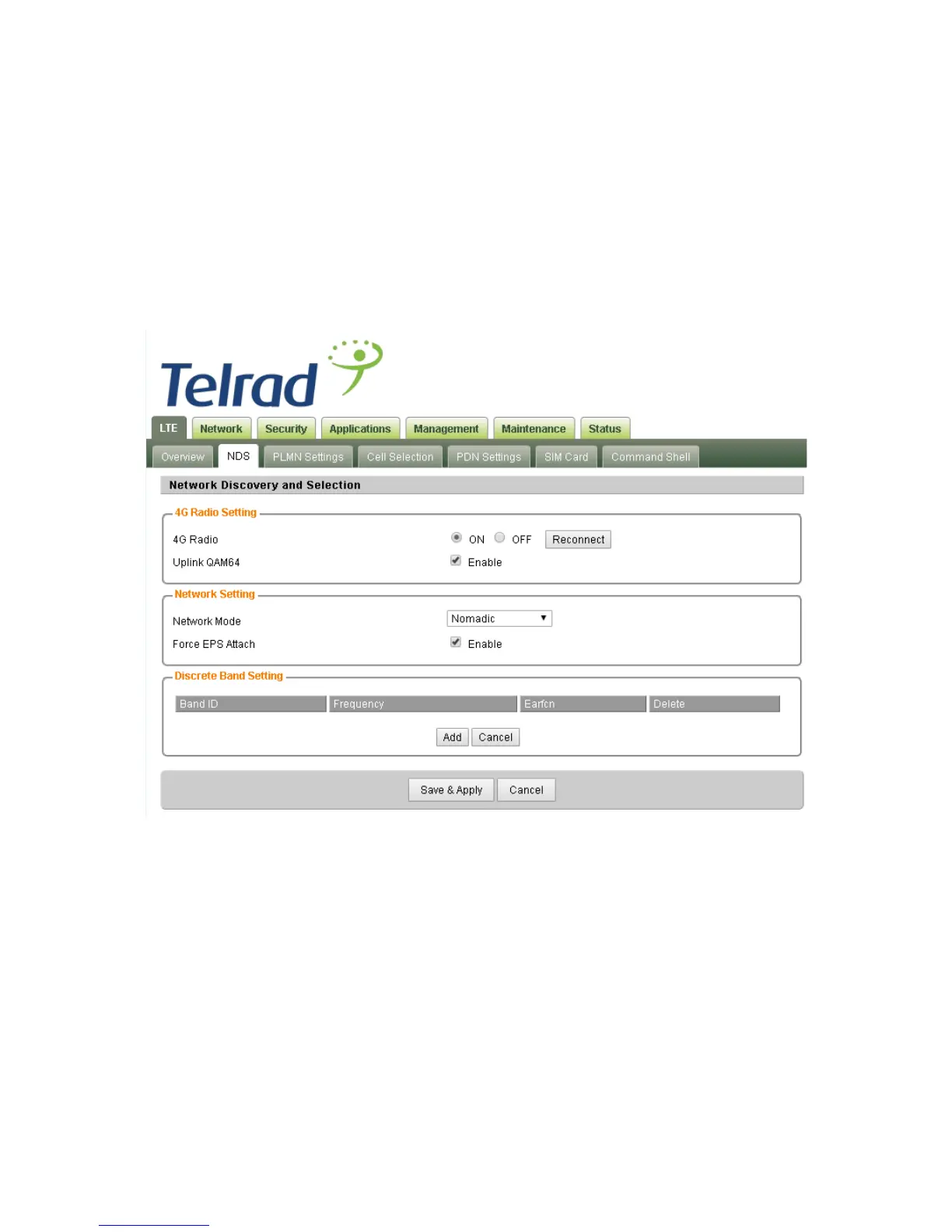 The LTE radio can be enabled or disabled via 4G Radio setting. The radio can also be reset