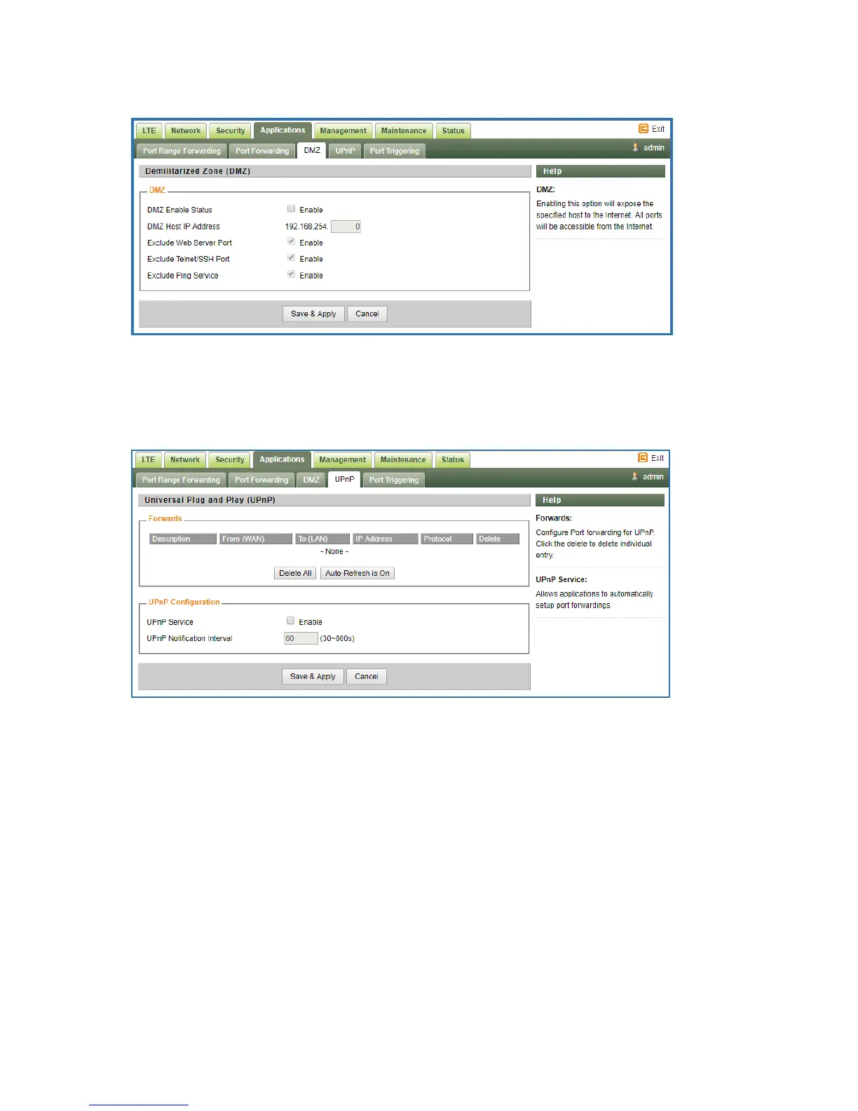 This menu allows user to configure the UPnP application for on-demand “DMZ” support. The