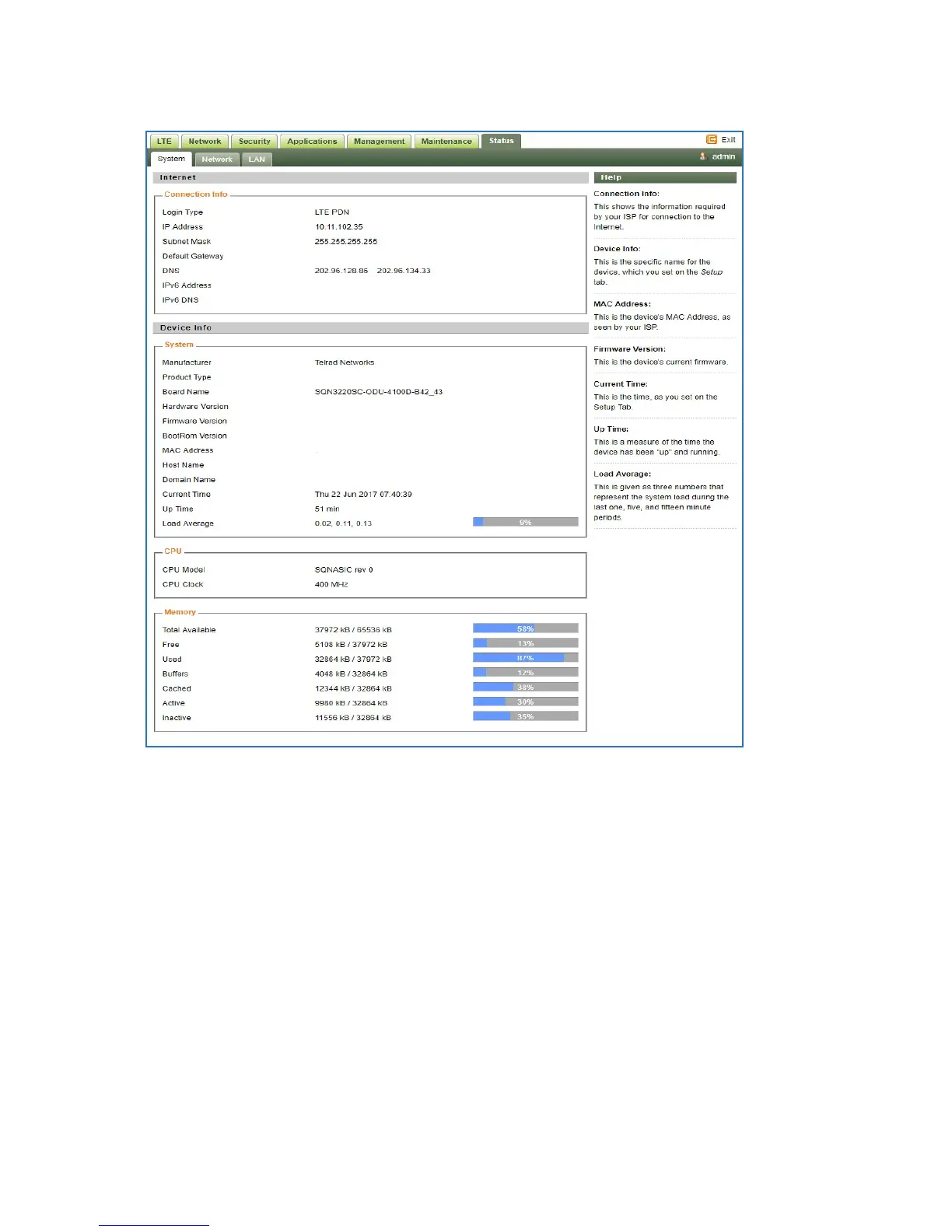 The menu shows the general network status that includes PDN interface info, device routing