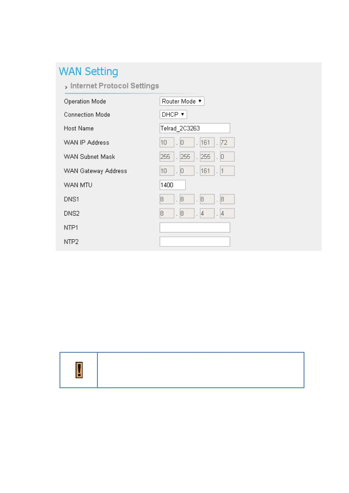 WAN IP Address/ Subnet Mask/ Gateway Address: These values are un-editable when