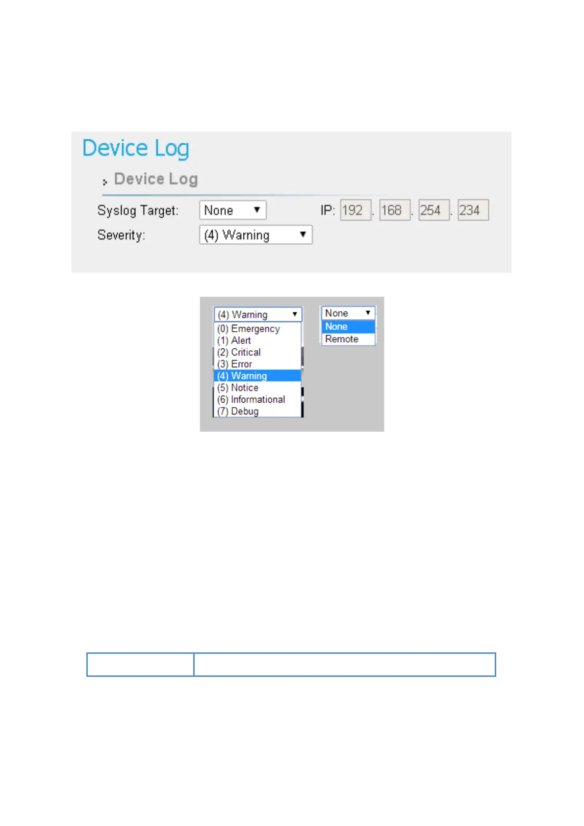 ● Syslog Target: User can choose the output target to Web or Remote syslog server.