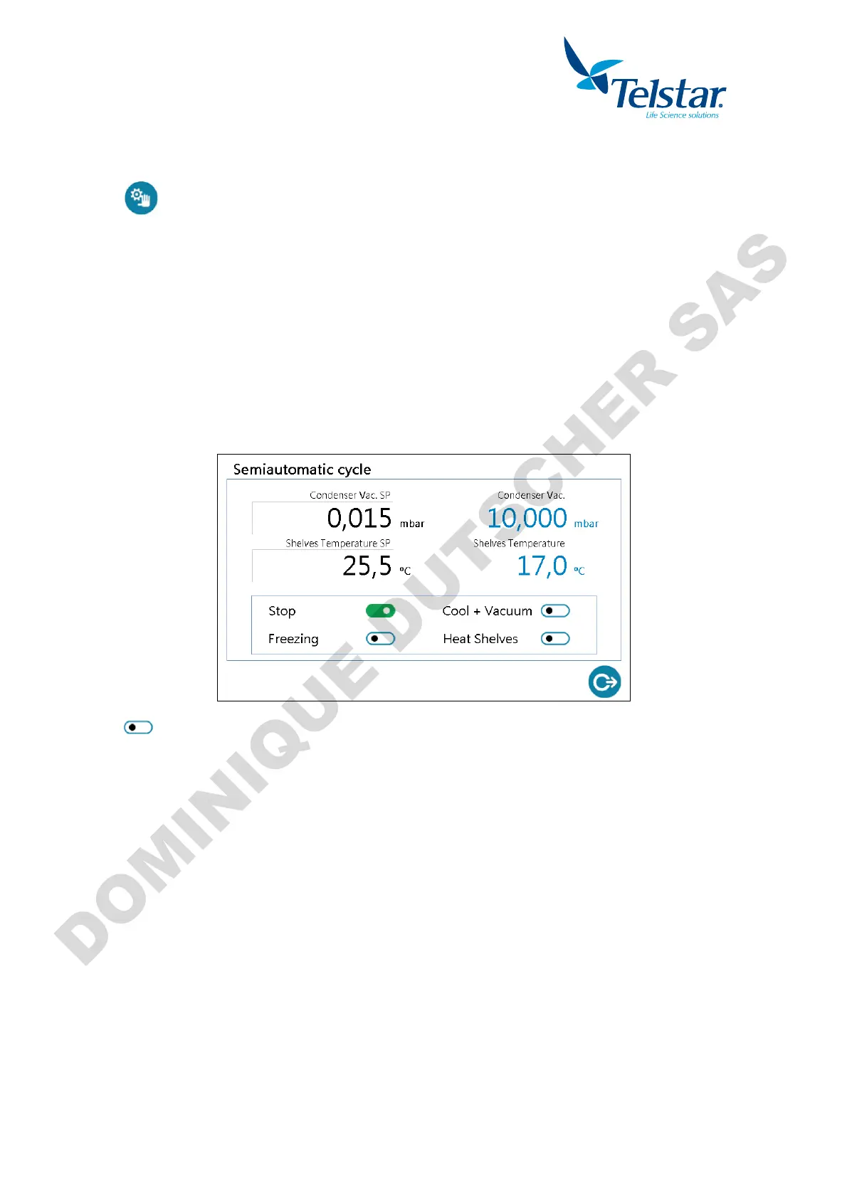 - Set point and real time values of the shelf temperature and the condenser vacuum,