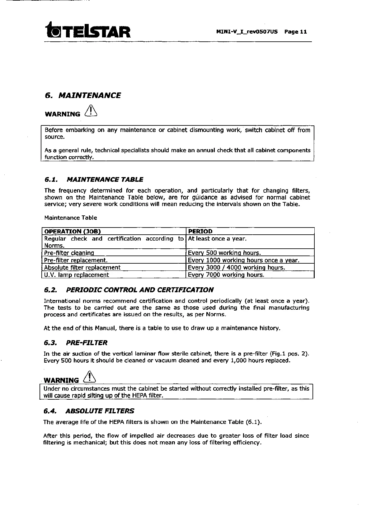 average life of the HEPA filters is shown on the Maintenance Table (6.1).
