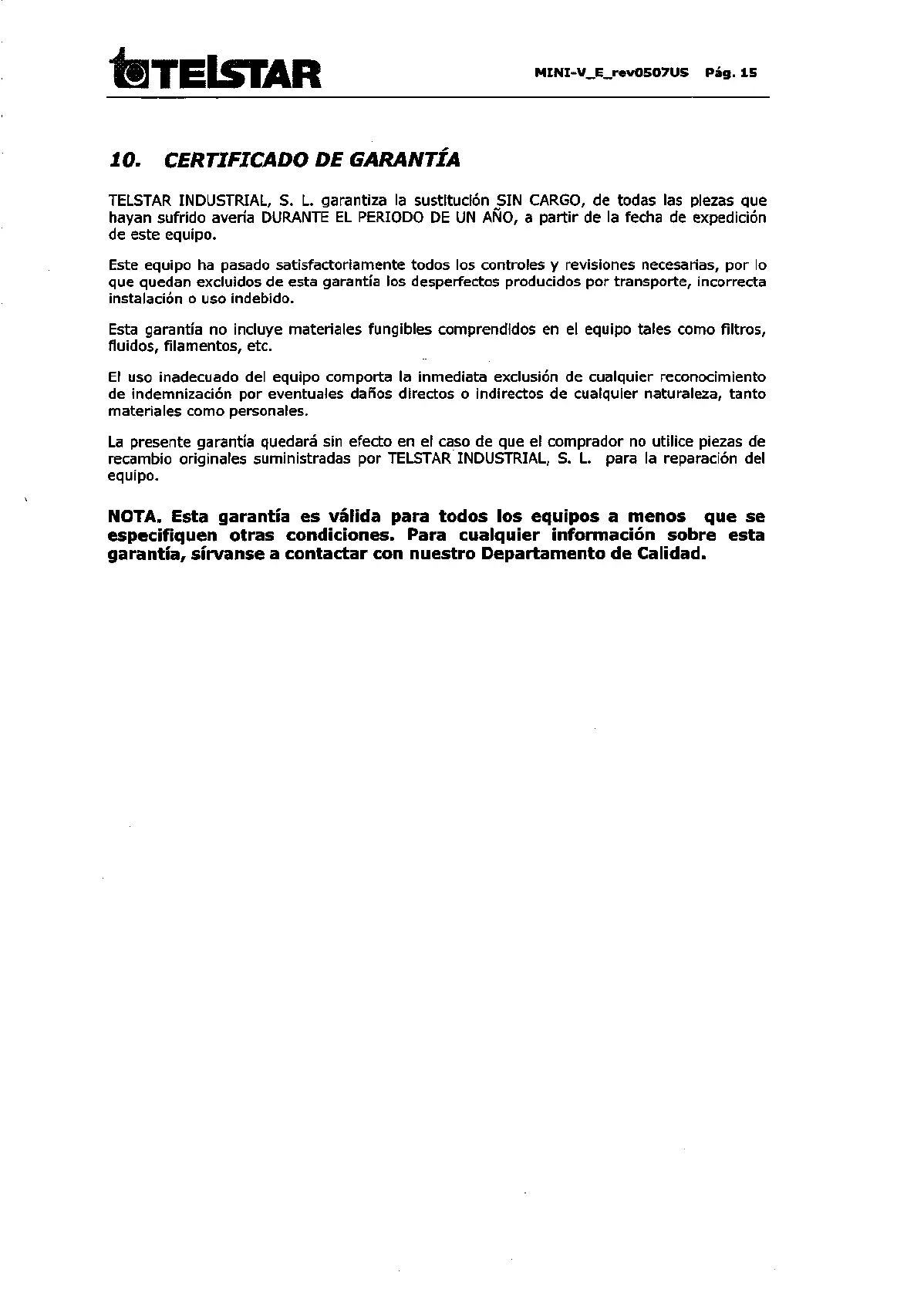 TELSTAR INDUSTRIAL, S. L garantiza la sustitucion SIN CARGO, de todas las piezas que