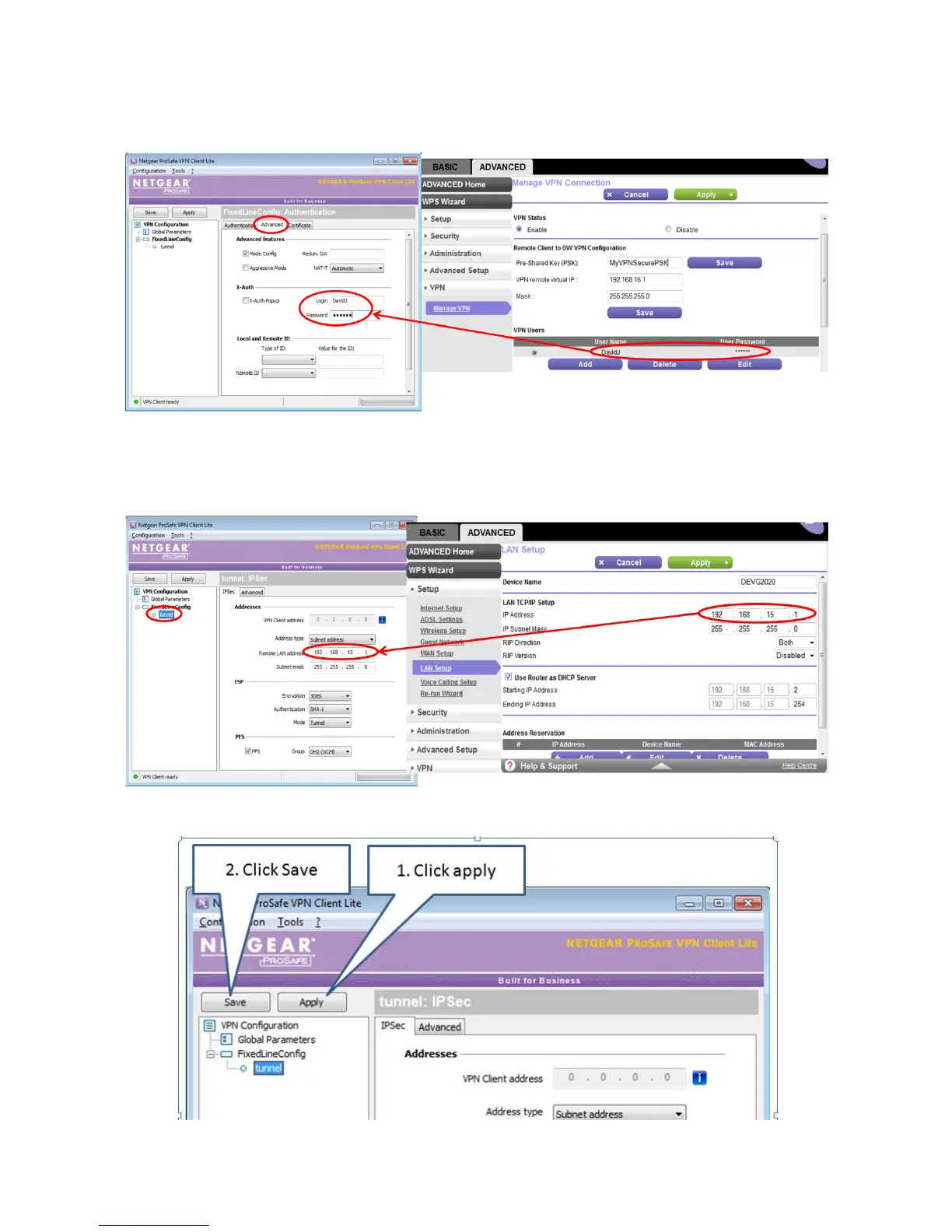 13. Select the “Advanced” tab and populate User Name and Password set up on the Netgear gateway VPN