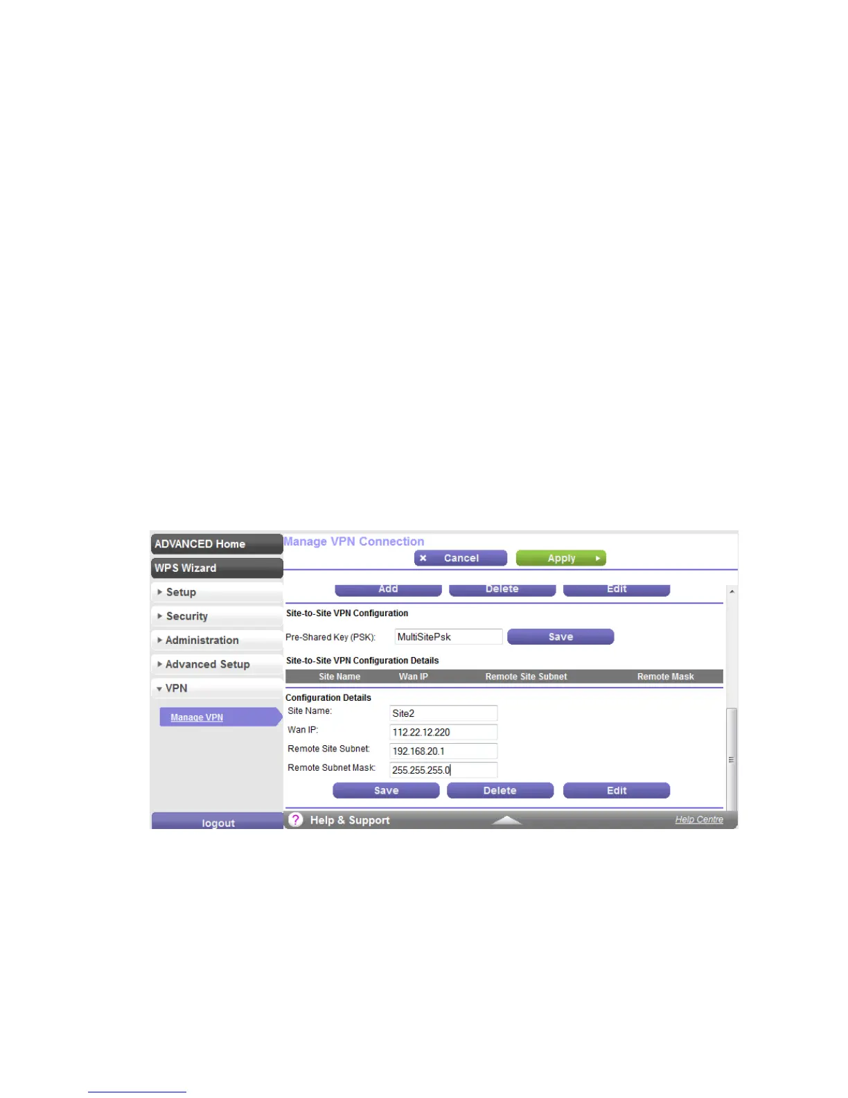1. On the first DEVG2020 GW device, navigate to the Advanced tab and select VPN > “Manage VPN” menu