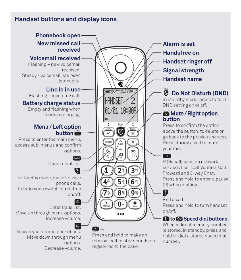 Handset buttons and display icons