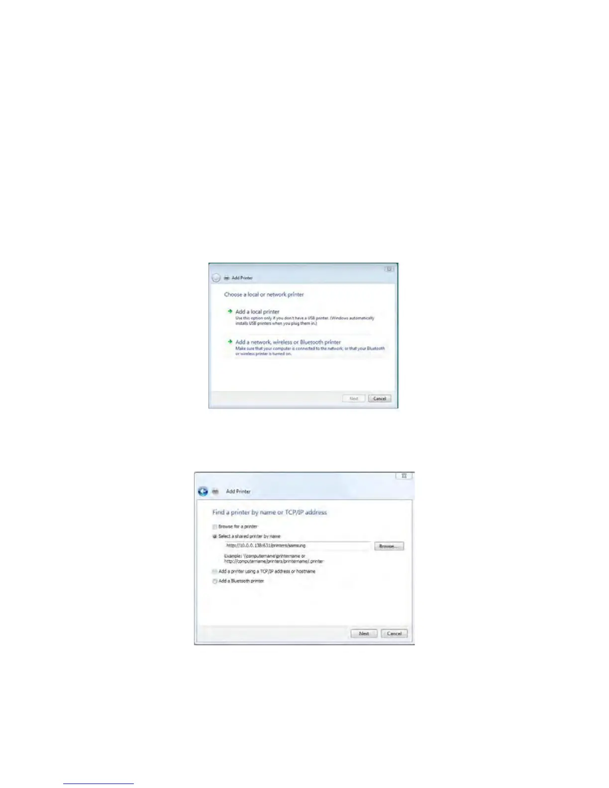 4. Clickontheradio-buttonlabeledSelectasharedprinterbyname,andtype