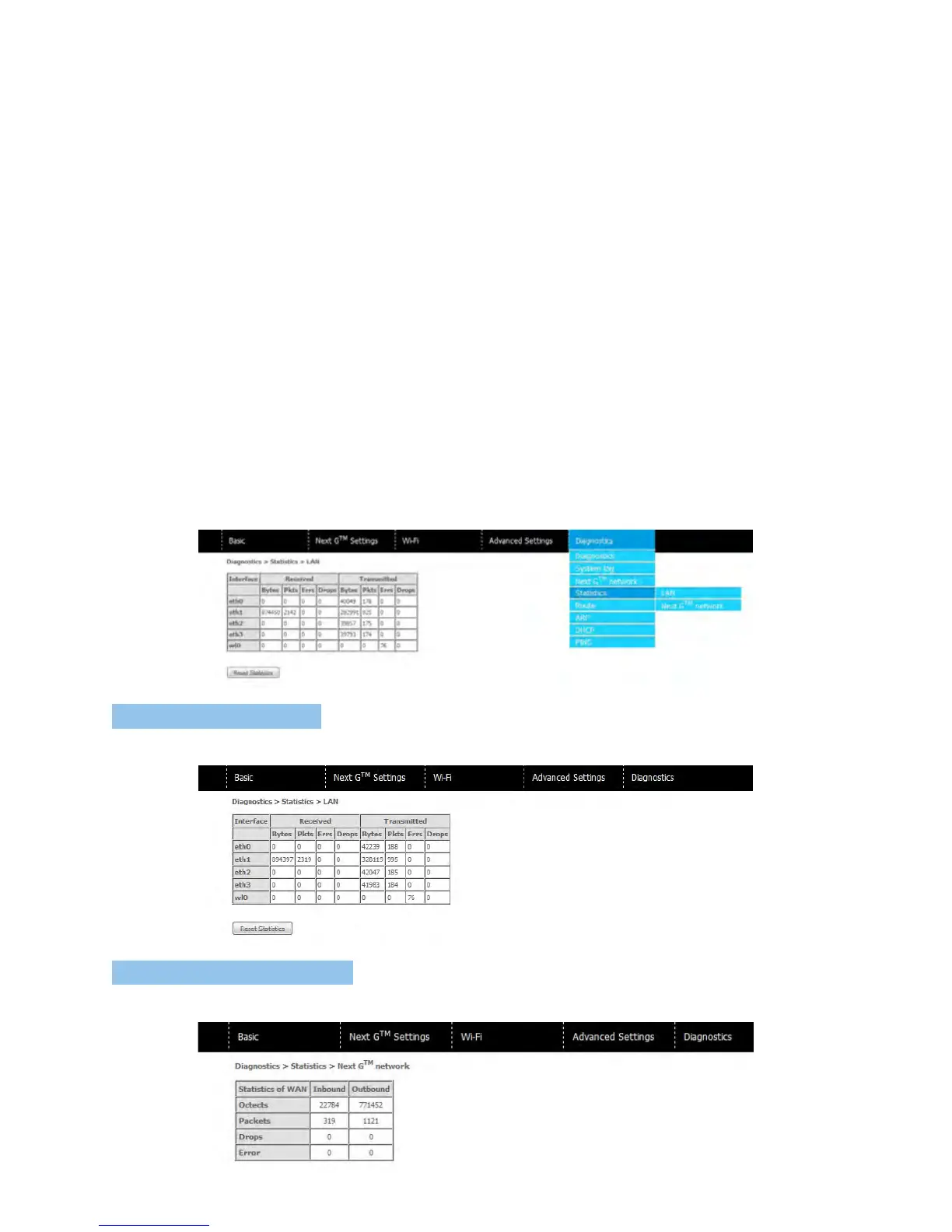 ThisscreendisplaysstatisticsfortheEthernetandWirelessLANinterfaces.