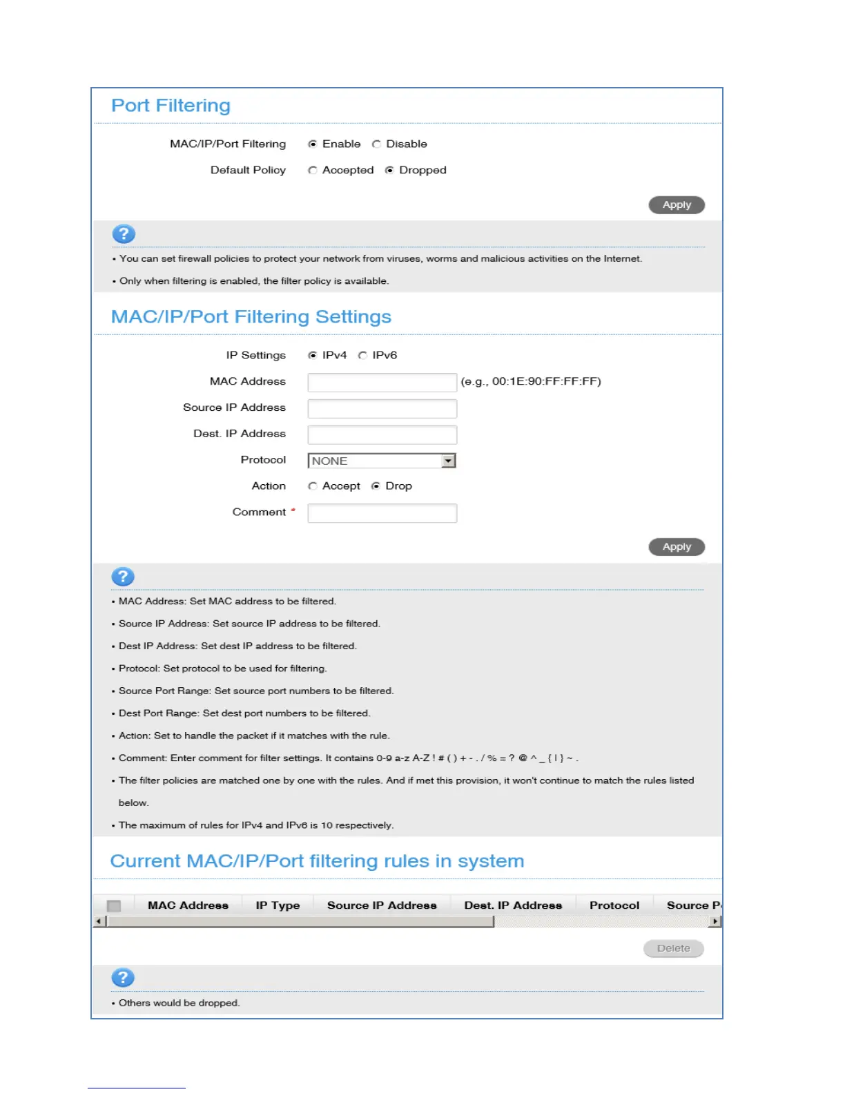 Telstra MF65 - Firewall: Port Filtering; Port Filtering Configuration