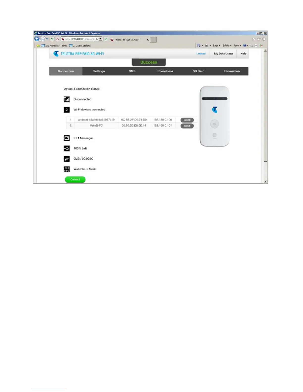 The Connection tab shows the summary device status, how many devices
