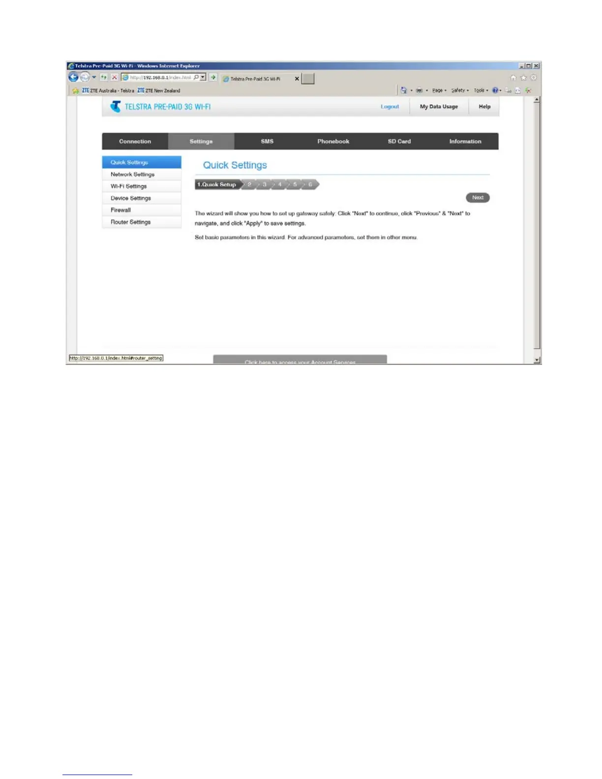 Telstra MF65 - Quick Settings Wizard; Using the Quick Settings Wizard