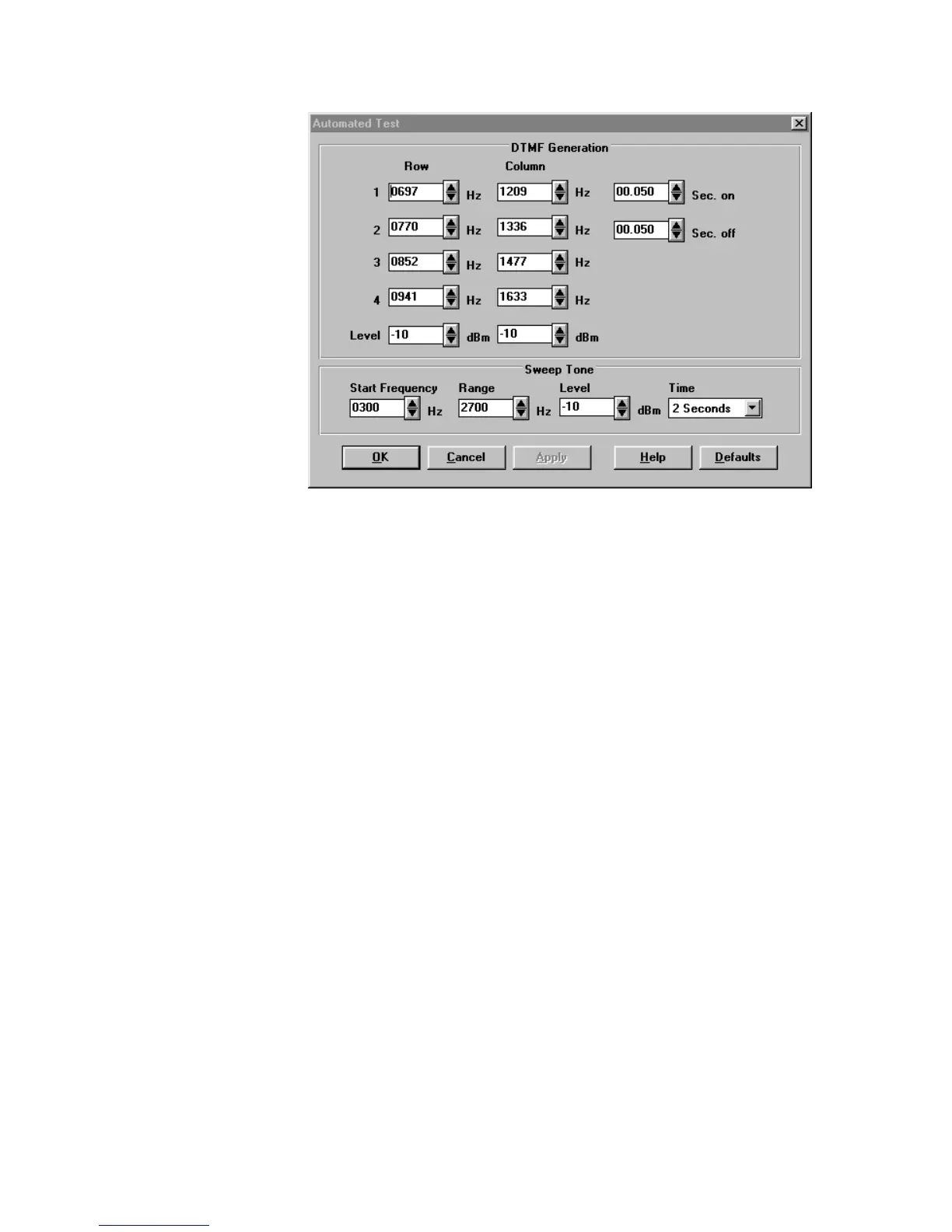 The DTMF Generation feature allows for the setting of the frequency, signal level, and