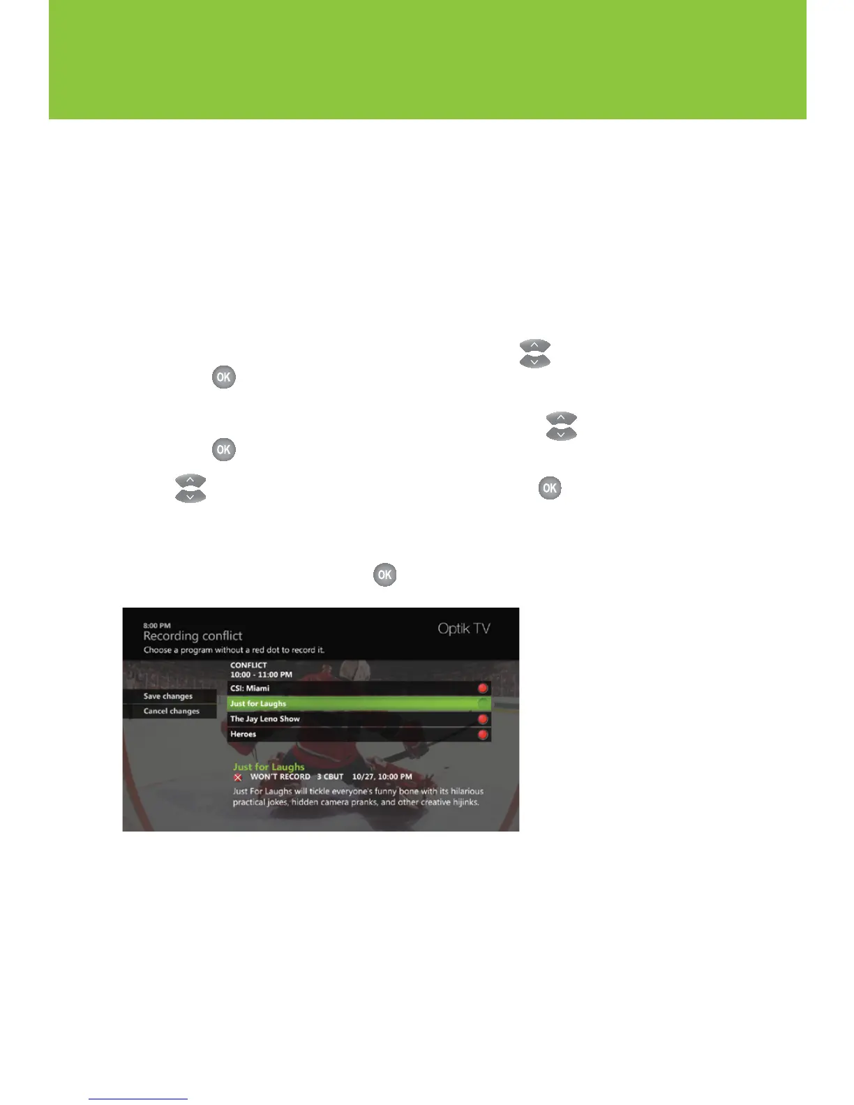To resolve the conflict by changing which programs to record, use to select Resolve conflict