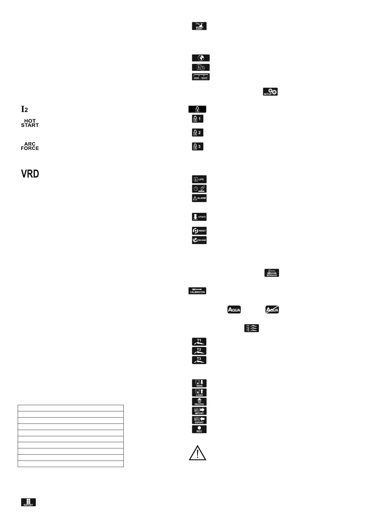 (corrente, tensione di saldatura e il diametro dell’elettrodo consigliato).