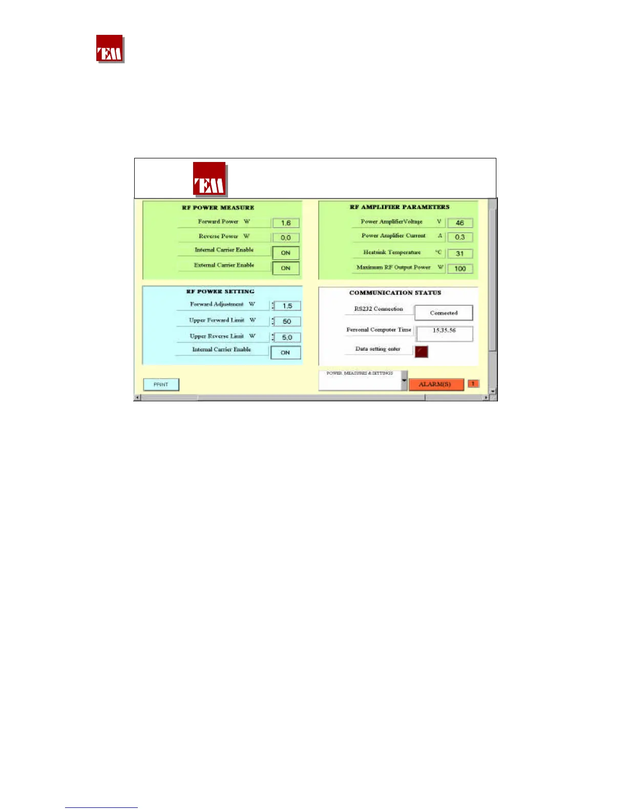 RF POWER SETTING window. At every new setting a changing of the measurement displayed