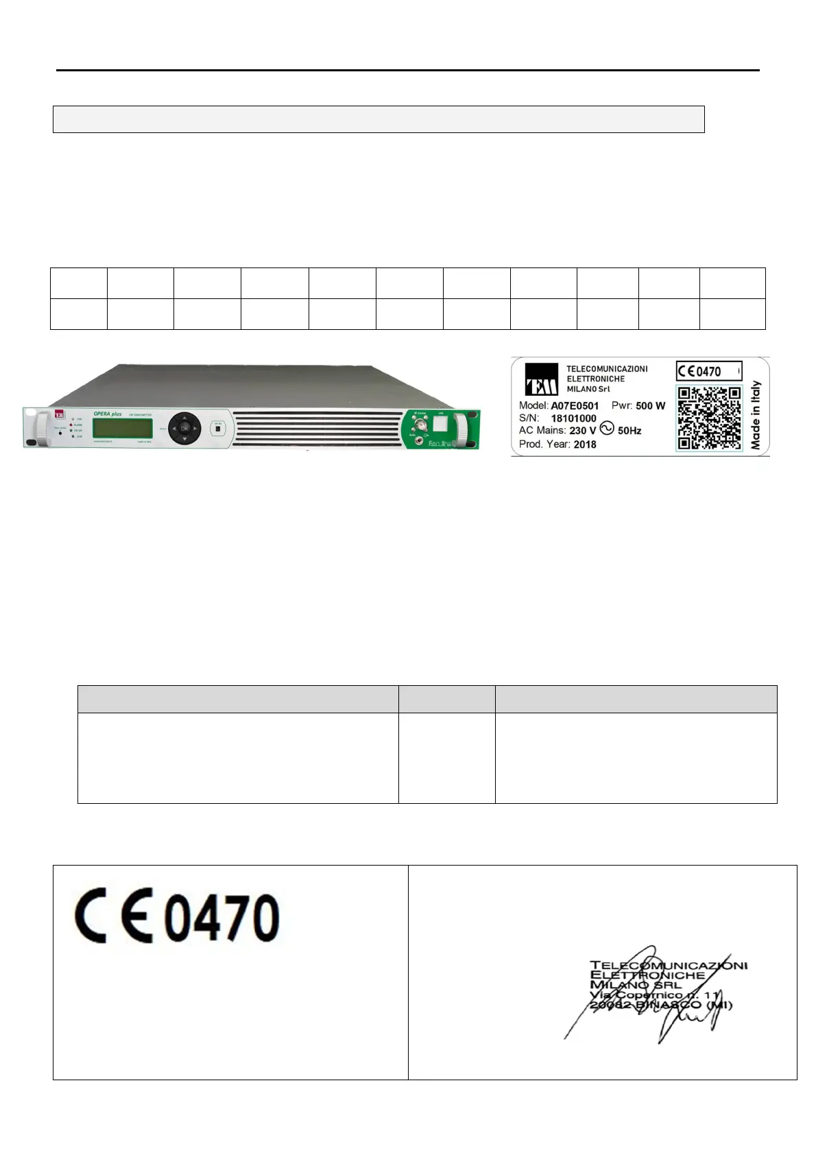 Apparecchio radio Marca: TEM Trasmettitore VHF FM Modello A07E0501 – Potenza RF 500W N° serie: Vedi Etichetta