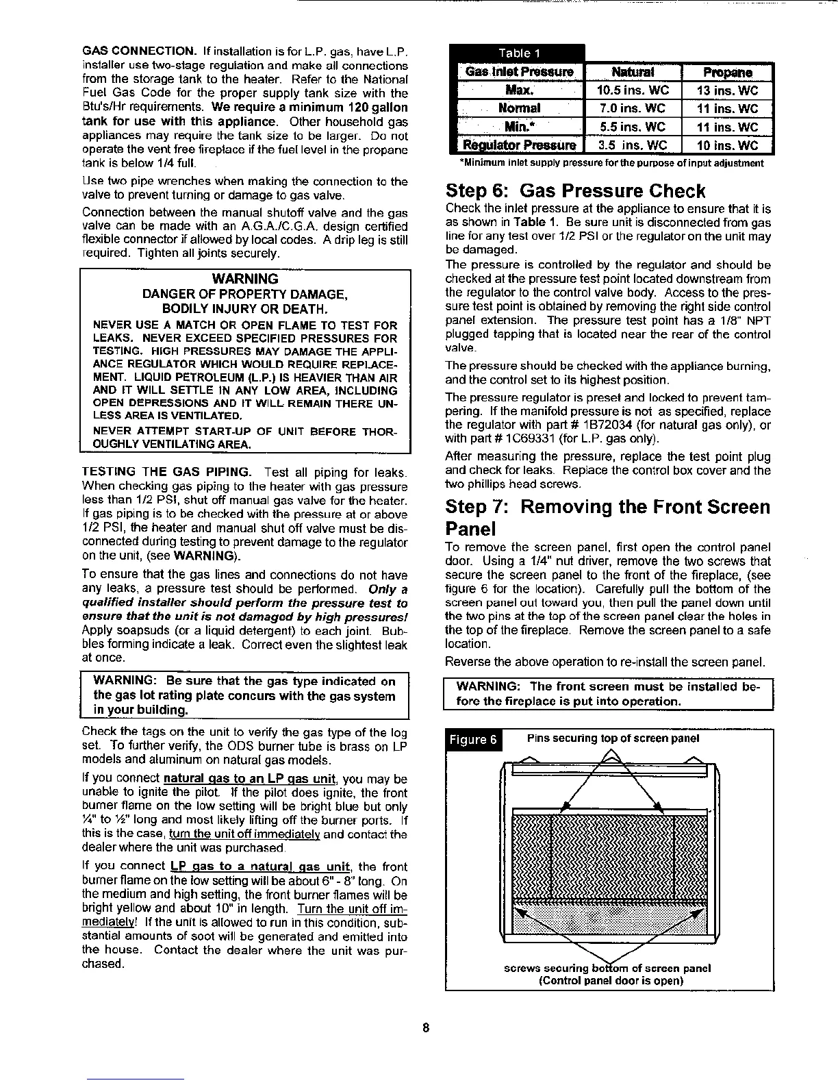 Temco ADF3324N - Gas Connection and Pressure Checks; Gas Pressure Check Procedure; Front Screen Panel Removal