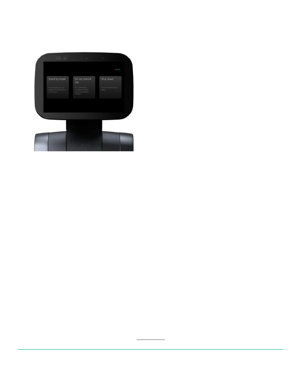 • Standby mode: temi’s display and LED brightness will decrease to a minimum