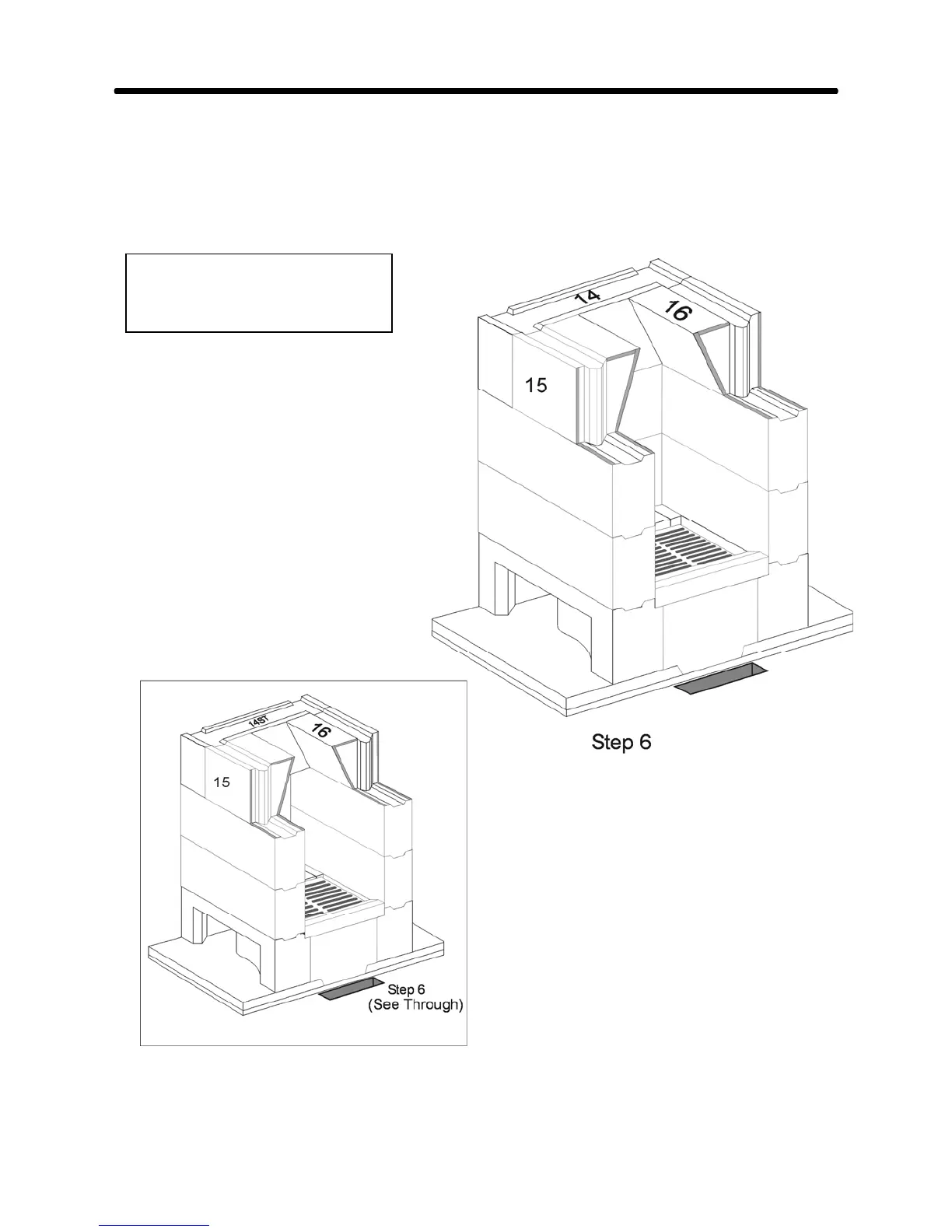 Install the lintel course, parts 14, 15 & 16, in order, using a small (3/8”) bead of refractory mortar