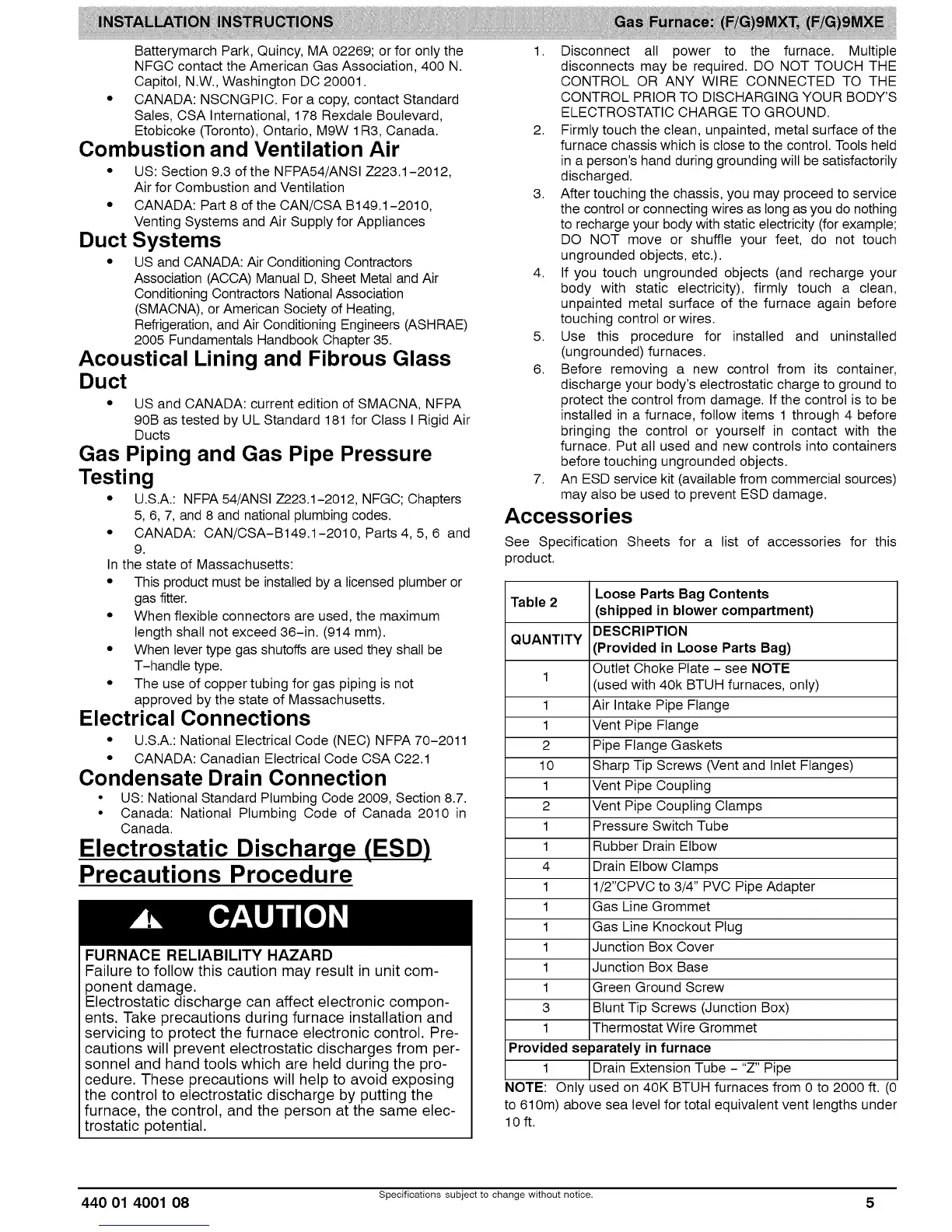 • U.S.A.: NFPA 54/ANSI Z223.1-2012, NFGC; Chapters