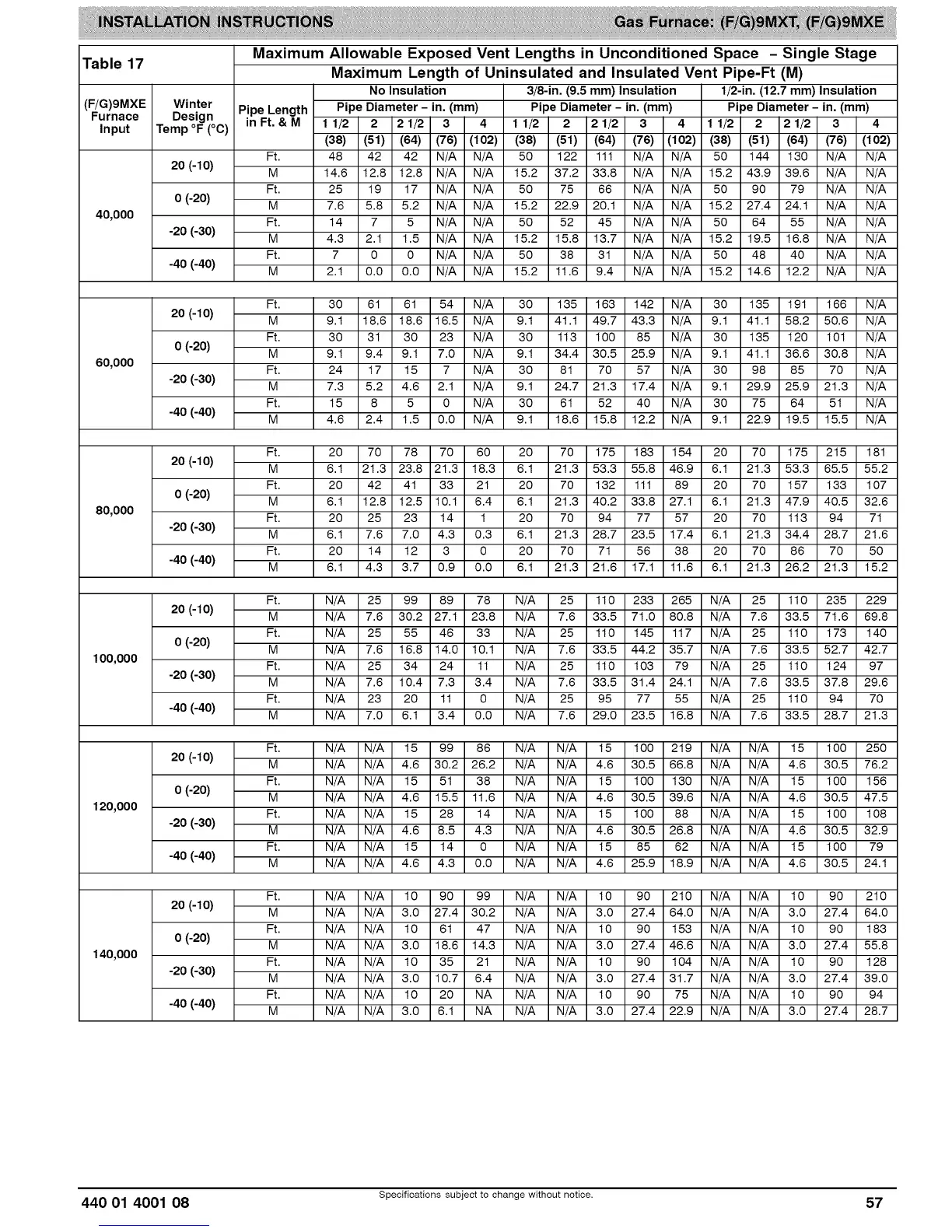Maximum Length of Uninsulated and Insulated Vent Pipe-Ft (M)