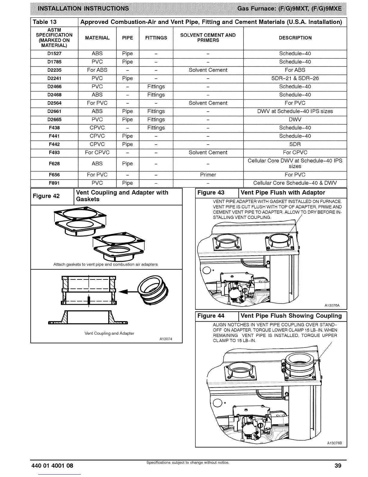 Approved Combustion-Air and Vent Pipe, Fitting and Cement Materials (U.S.A. Installation)