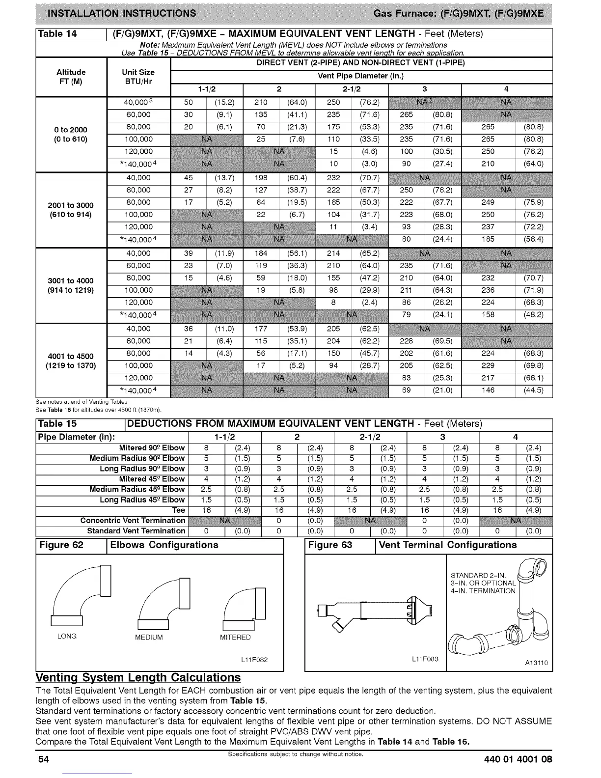 Table 14 (F/G)9MXT, (F/G)9MXE - MAXIMUM EQUIVALENT VENT LENGTH - Feet (Meters)