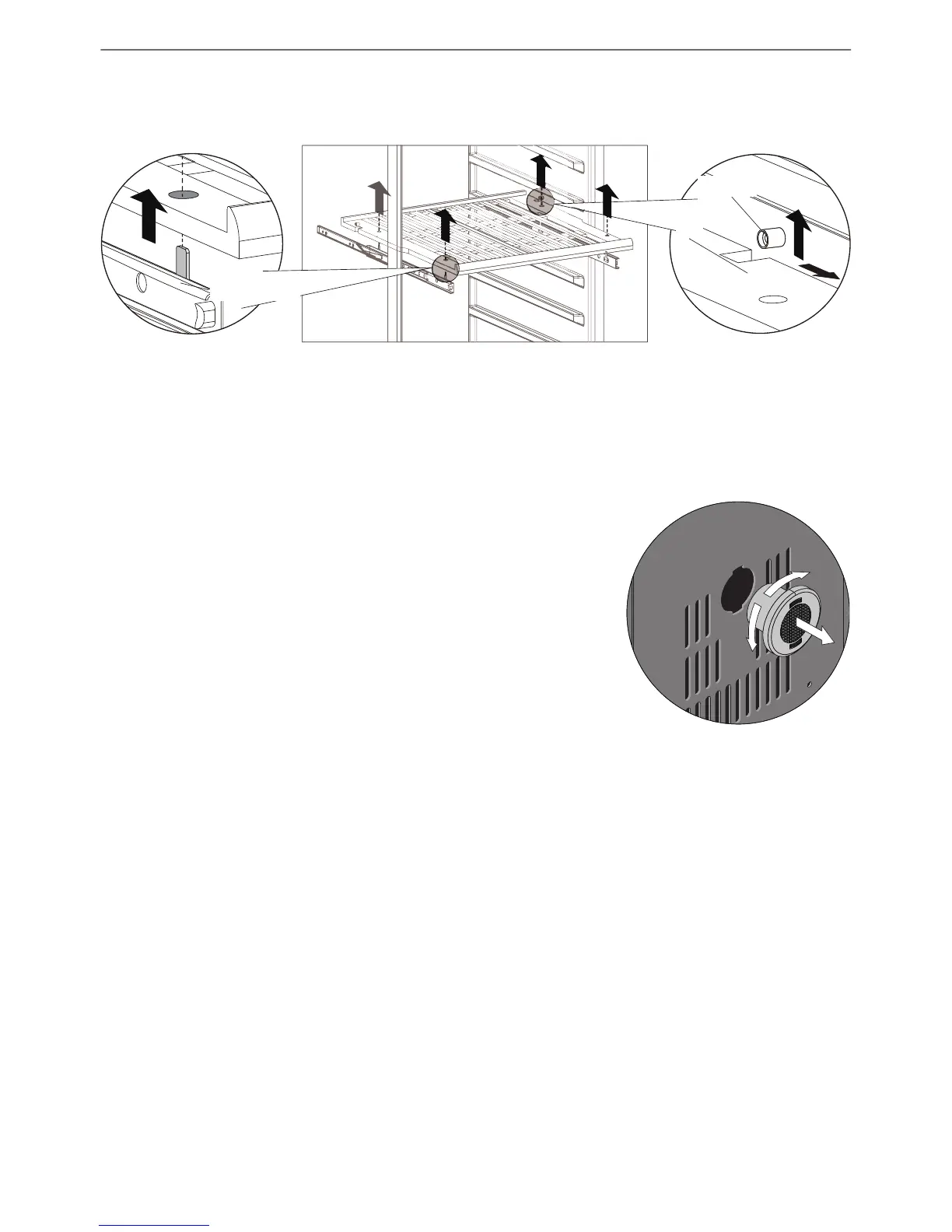For a model with Telescopic Rail, pls. lift the whole Shelf upwards horizontally