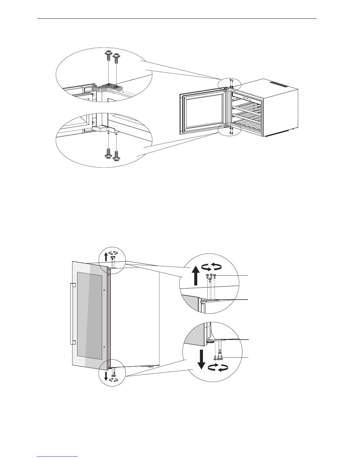 o Screw the 4 screws of the upper hinge and bottom hinge tightly to x the