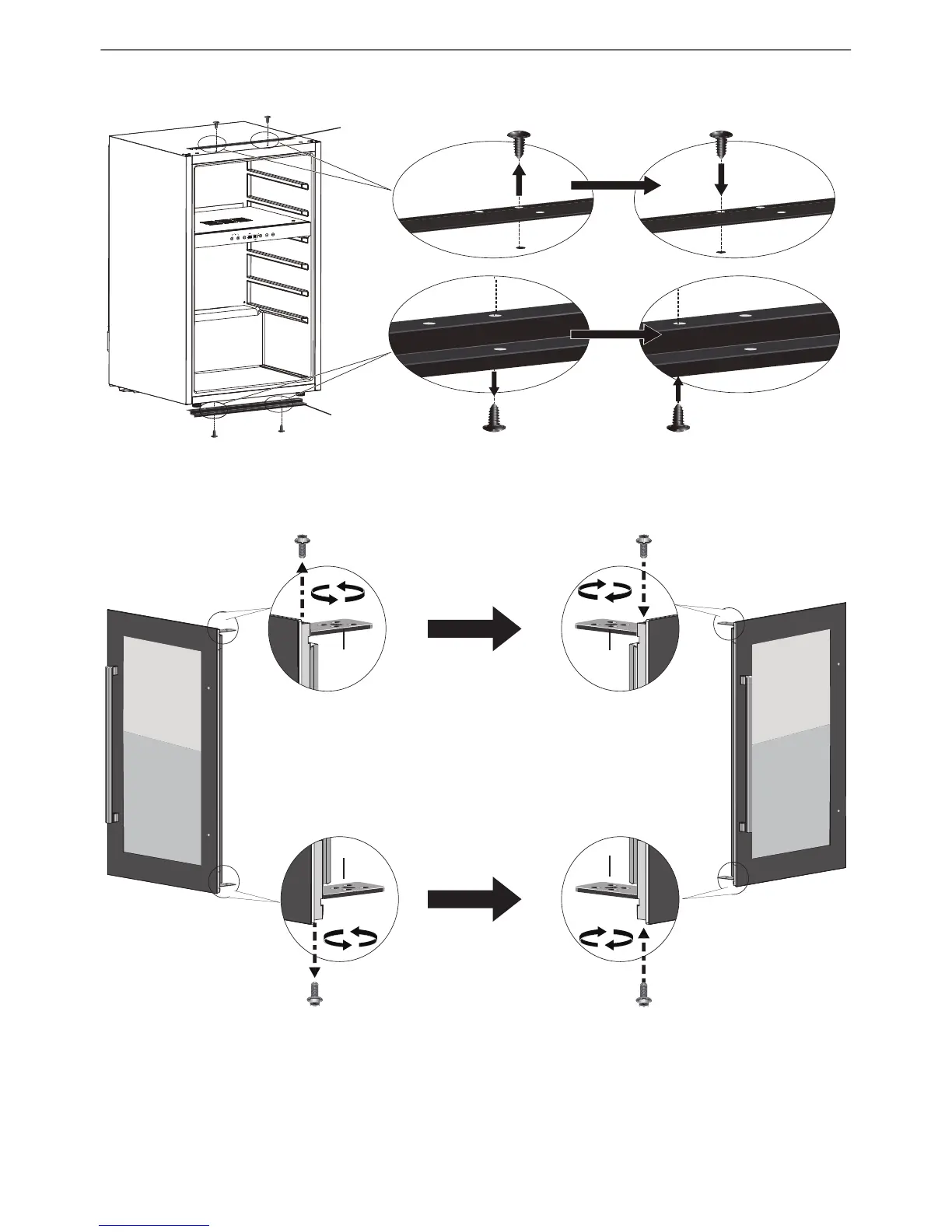 3.Unscrew the Upper Hnge and Lower Hnge from the rght sde of door, move and screw the