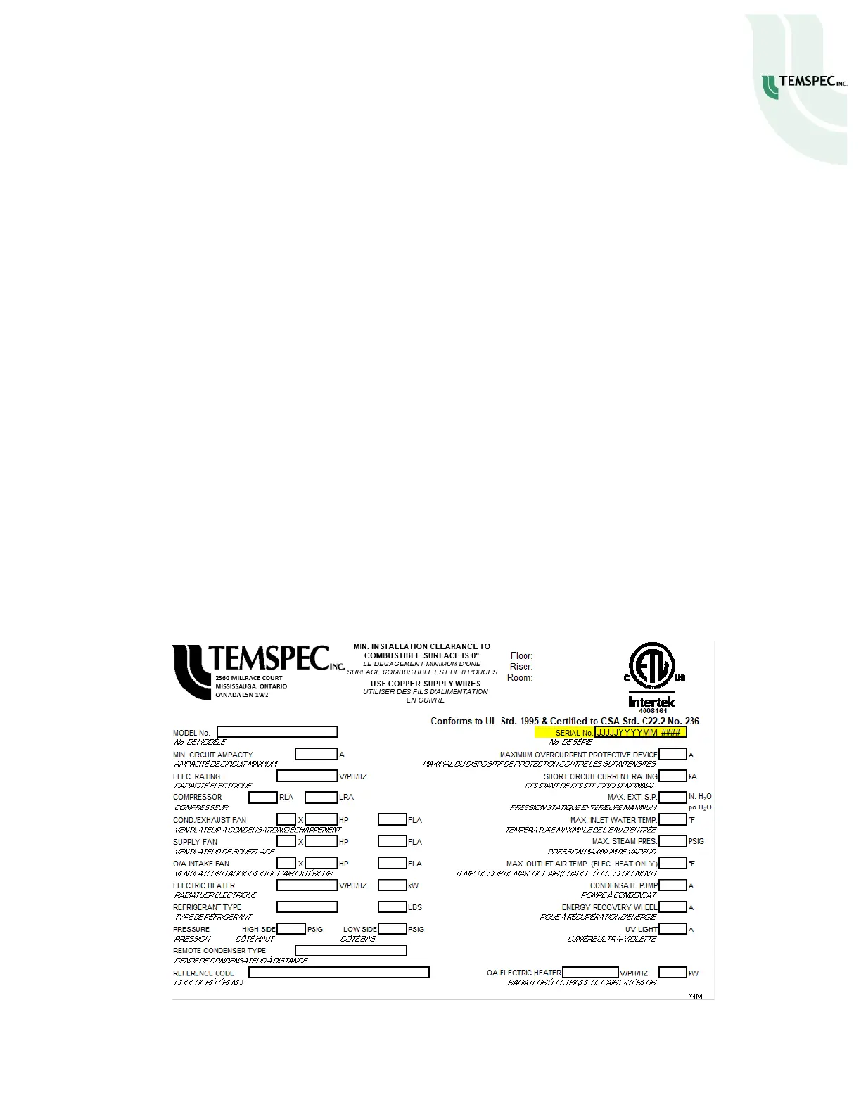 Be sure to provide the unit serial number, which is located on the ETL label, on the electrical box