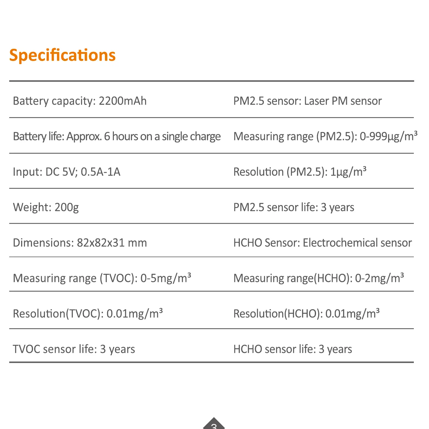 PM2.5 sensor life: 3 years