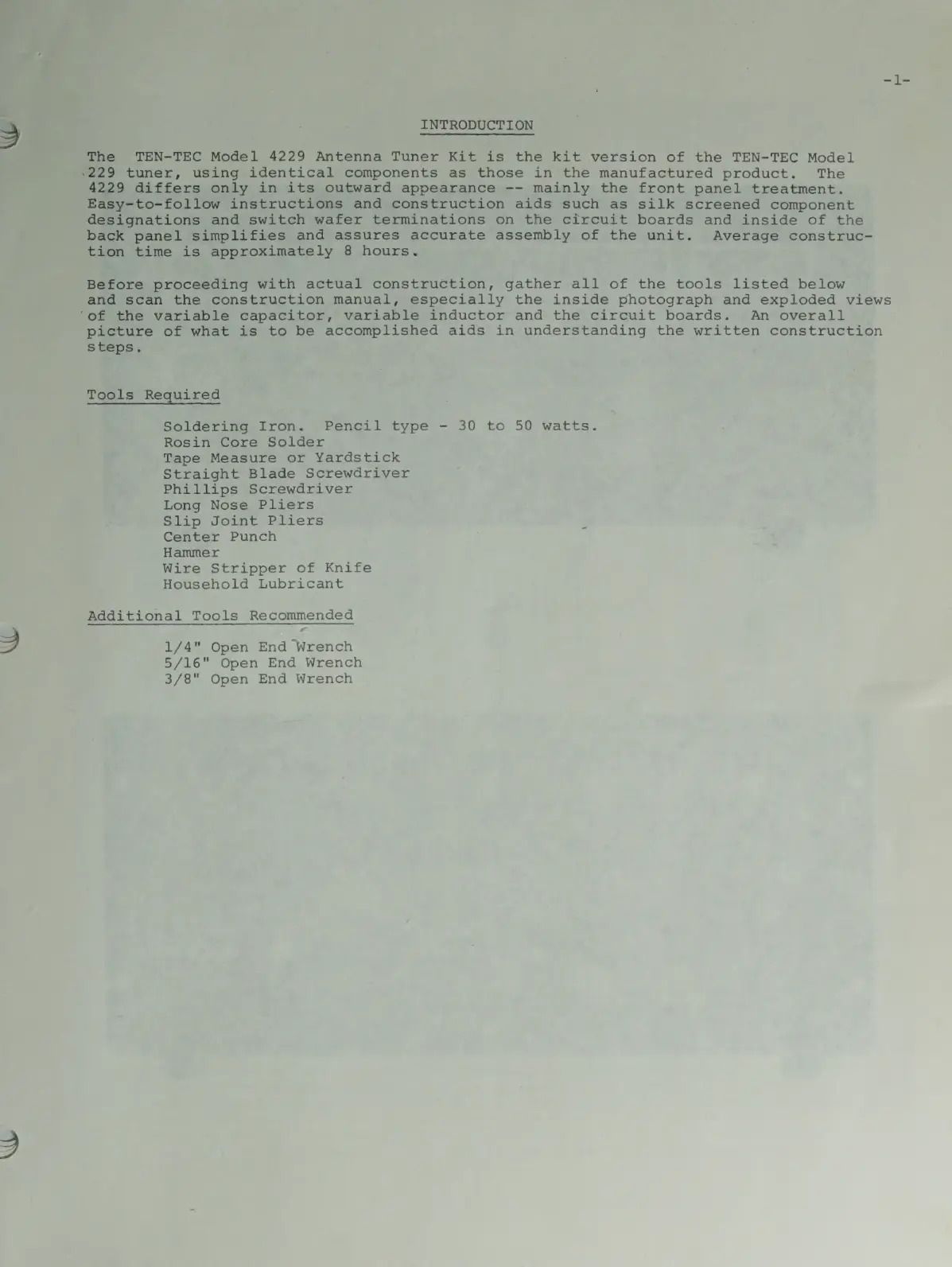 Ten-Tec 4229 - Introduction and Tools; Tools Required for Assembly; Recommended Additional Tools