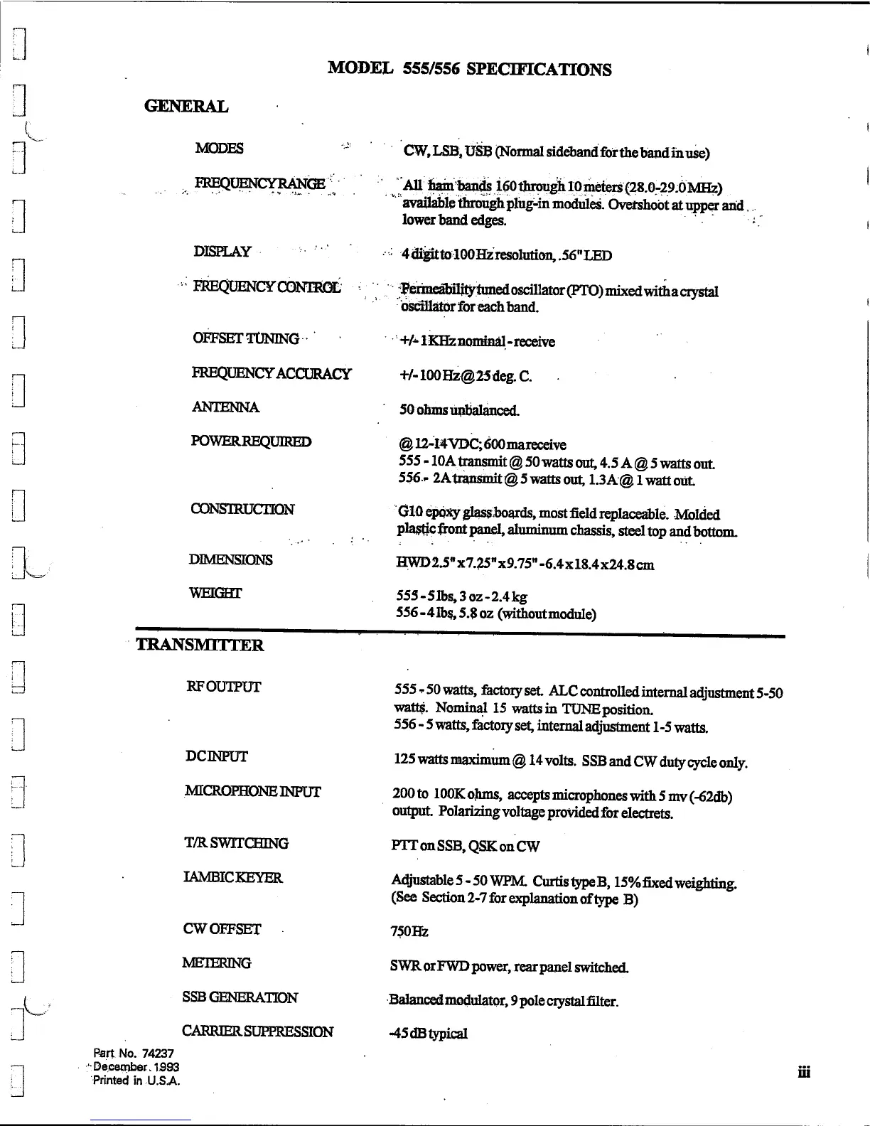 Ten-Tec 555 - Model 555;556 Specifications; General Specifications; Transmitter Specifications