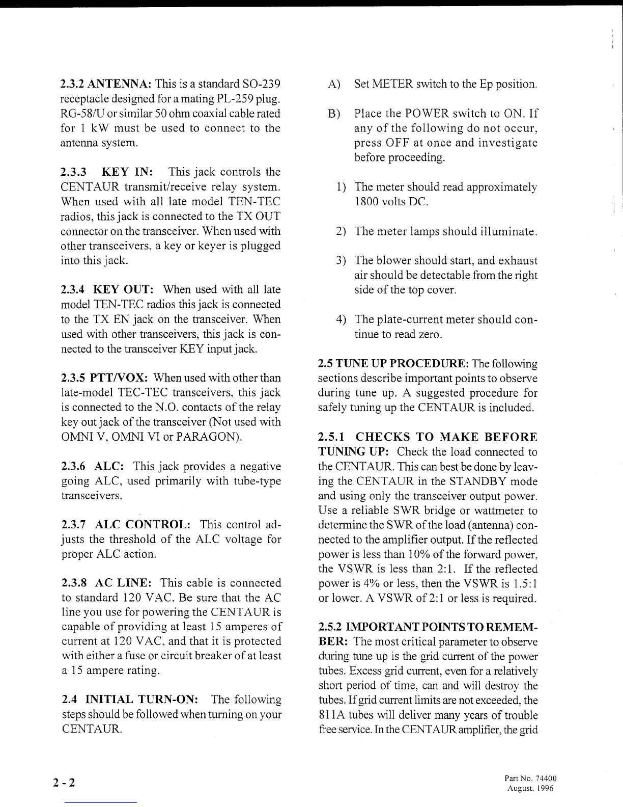 Ten-Tec Centaur 411 - 2.4 INITIAL TURN-ON; 2.5 TUNE UP PROCEDURE