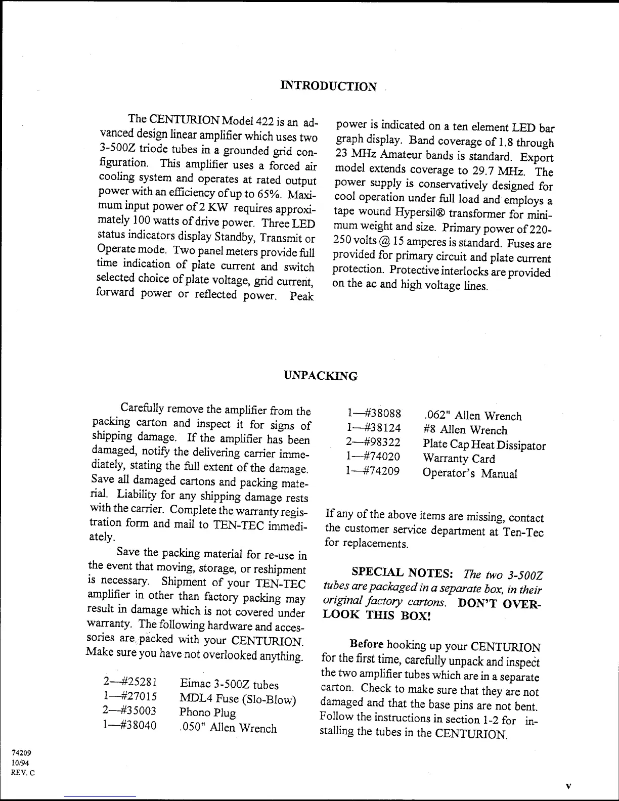 Ten-Tec Centurion 422 - Introduction and Unpacking Procedures; Product Overview and Features; Unpacking and Inspection Guide