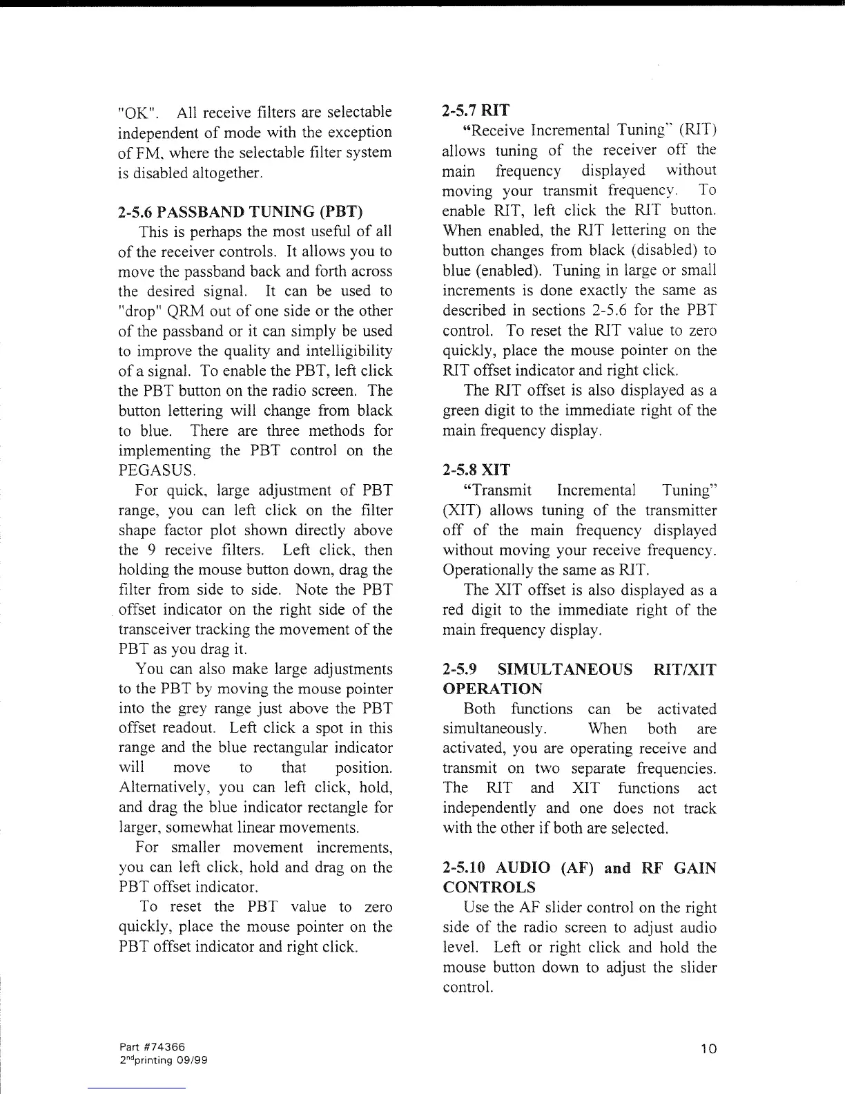 Ten-Tec Pegasus 550 - 2-5.6 Passband Tuning (PBT); 2-5.7 Receive Incremental Tuning (RIT); 2-5.8 Transmit Incremental Tuning (XIT); 2-5.10 Audio (AF) and RF Gain Controls