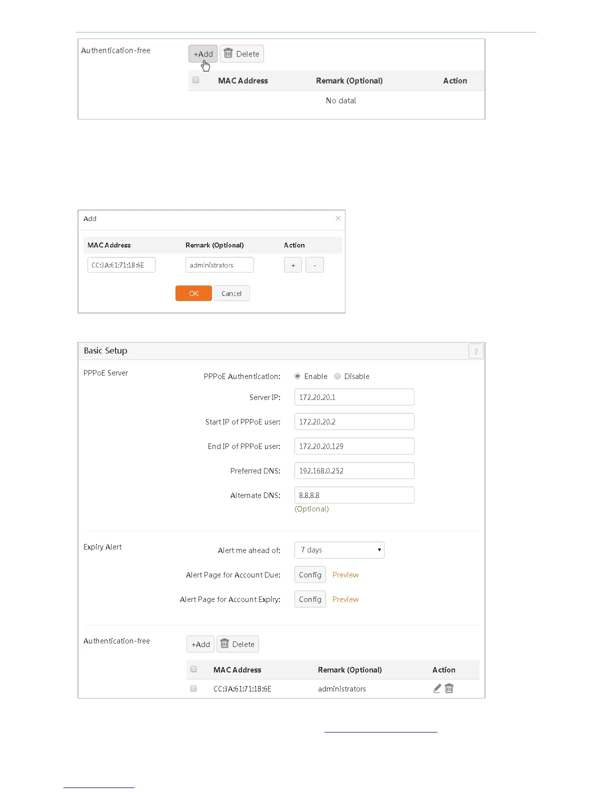 MAC Address: Enter a MAC address of a client that can access the Internet without any authentication.
