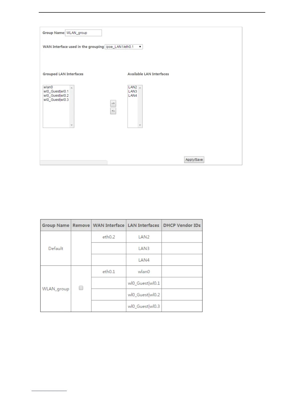 service IP over Ethernet (eth0.1), and all wired interfaces (port 1, 2, and 3) are classified into the default group