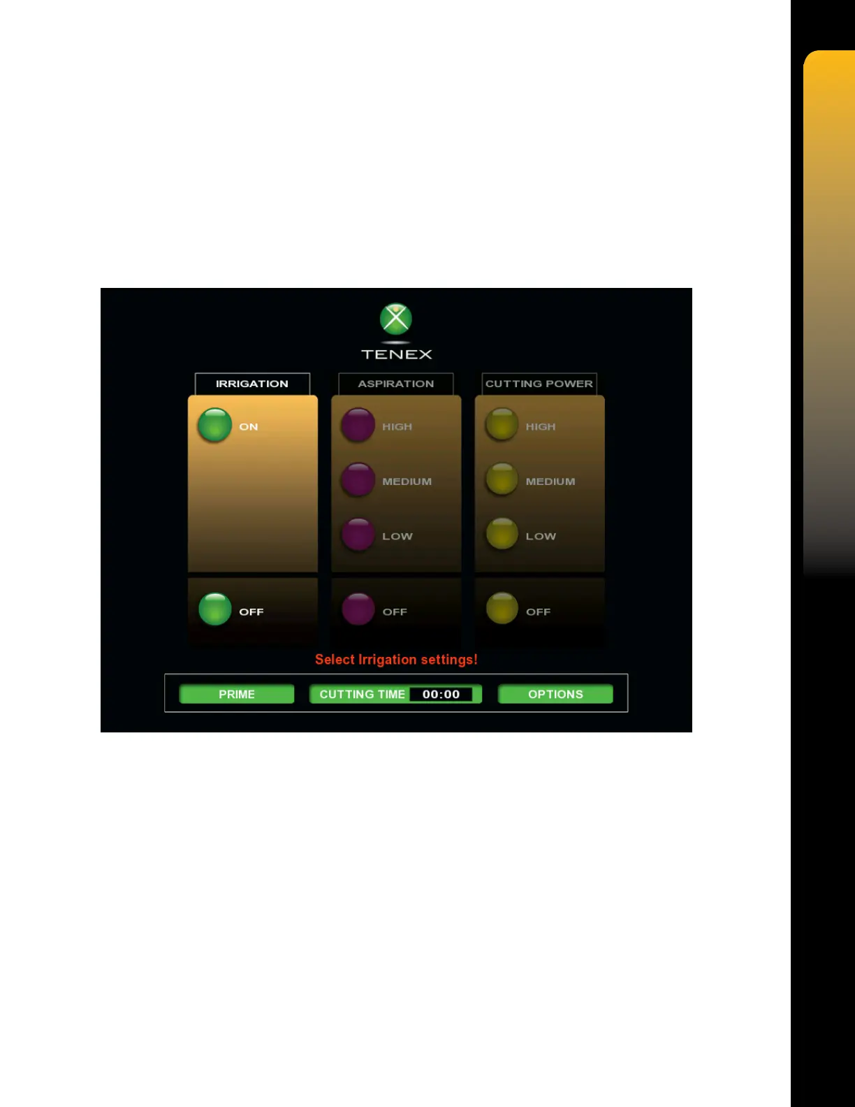 When IRRIGATION is selected ON, the irrigation pinch valve will open when the Foot Pedal is